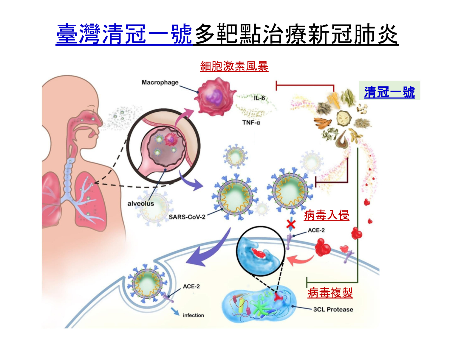 三軍總醫院中醫部主任黃怡嘉先解釋,西藥最早是靠瑞德西韋、奎寧,再搭配類固醇,想辦法壓制免疫,但副作用相對比較大,所以「清冠一號」多靶點治療的好處就是可以抗病毒、調節免疫,提高病患的治癒率、降低死亡率。