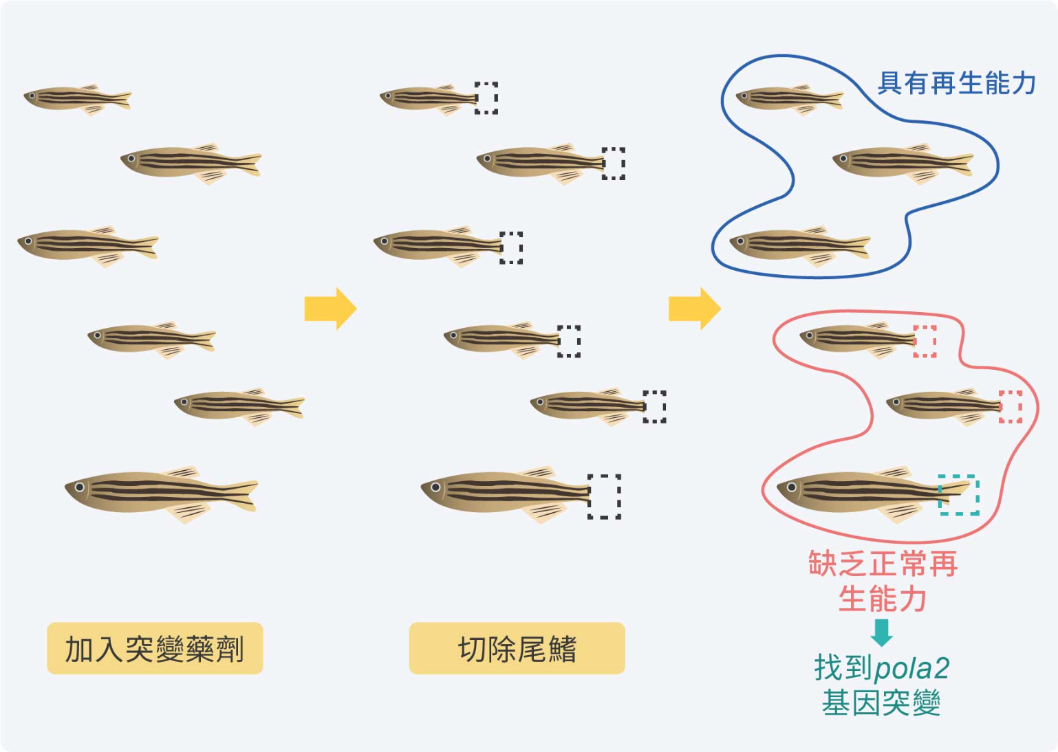 經由這個研究方法,陳振輝與其研究團隊,發現有個基因pola2,其表現活性竟然可以影響尾鰭再生後的形狀或大小!也就是說,指引尾鰭重建的「再生記憶」其實也可以改變。
