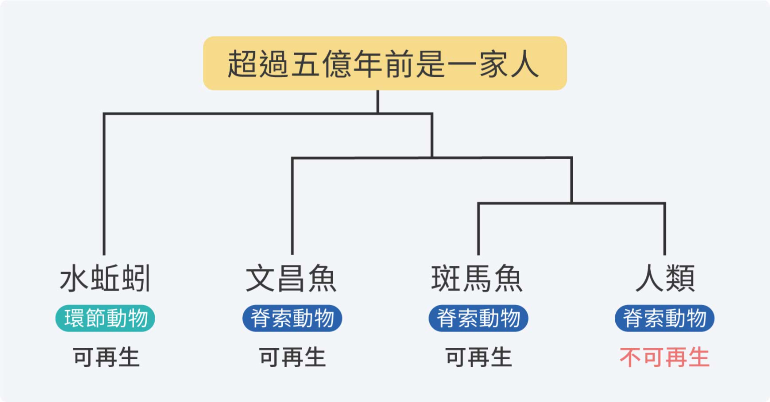 文昌魚、水蚯蚓和斑馬魚,如今是差異很大的動物,演化上的共同祖先能追溯到超過五億年前;然而,它們依舊保有類似的機制維持再生記憶,表示這是一套非常遠古的調控之道。而人類也身為可再生動物的後裔,儘管早已喪失大部分的再生能力,或許仍存在一絲潛力,只待我們找到激活的辦法。