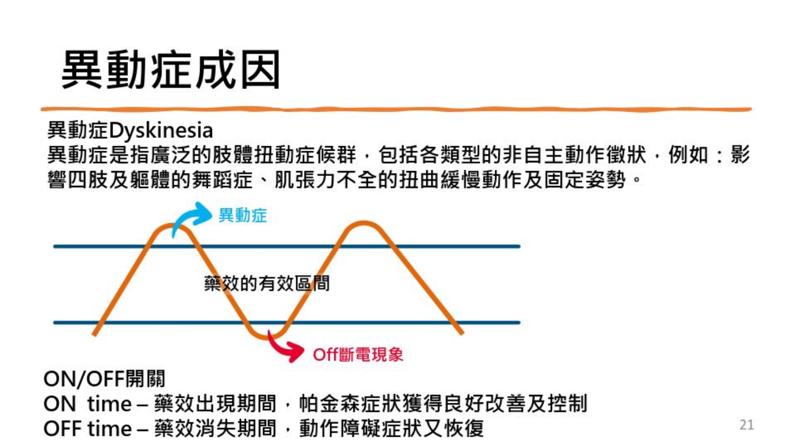 病友Andy表示,「ON代表有藥效、有行動力,OFF顯示無藥效時,全身會痠軟無力、寸步難行,這種情況就像是開車突然沒油、發不動!」而關於「異動症」,陸清松解釋,「異動症是指廣泛的肢體扭動症候群,包括各類型的非自主動作徵狀,例如影響四肢及軀體的舞蹈症、肌張力不全的扭曲緩慢動作及固定姿勢。」