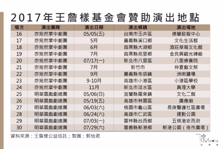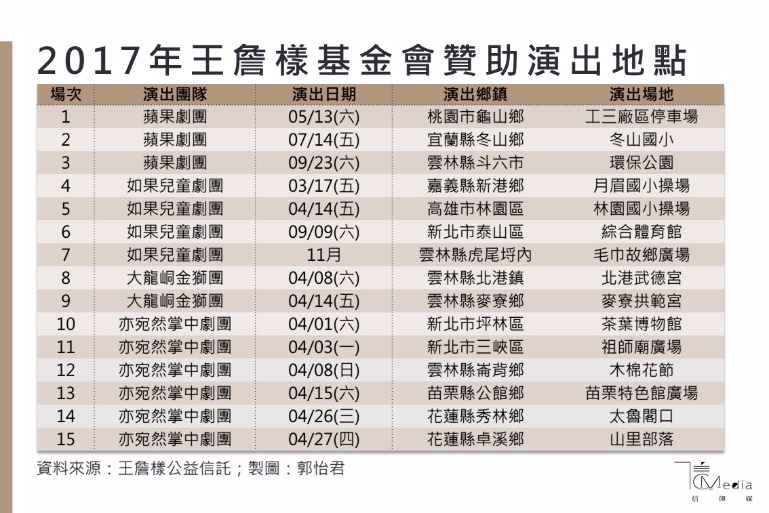 免費的蘋果劇團、如果兒童劇、亦宛然布袋戲、明華園以及大龍峒金獅團巡迴演出就要開始了,自3月起到年底,由台塑集團王詹樣公益信託贊助演出的戲劇將在宜蘭、桃園、新竹、苗栗、雲林、嘉義、台南、高雄及花蓮縣等偏鄉地區公演,王詹樣公益信託委員王文堯說「最有價值這個藝術,一定要有所傳承。」