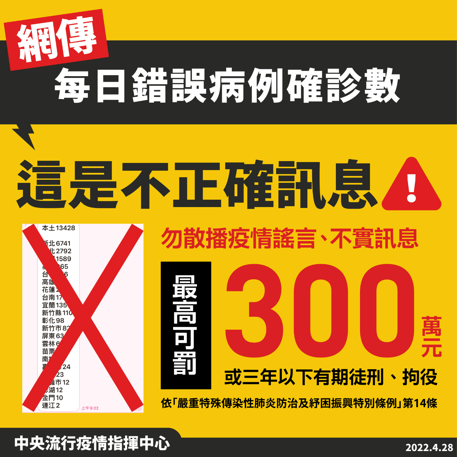 指揮中心嚴正澄清表示,近日社群軟體、網路流傳每日錯誤COVID-19病例數,例如今日流傳「本土確診13428人」等即為不正確訊息,每日疫情數據應由指揮中心公布,請民眾勿再轉傳與散布,以免觸法遭罰。