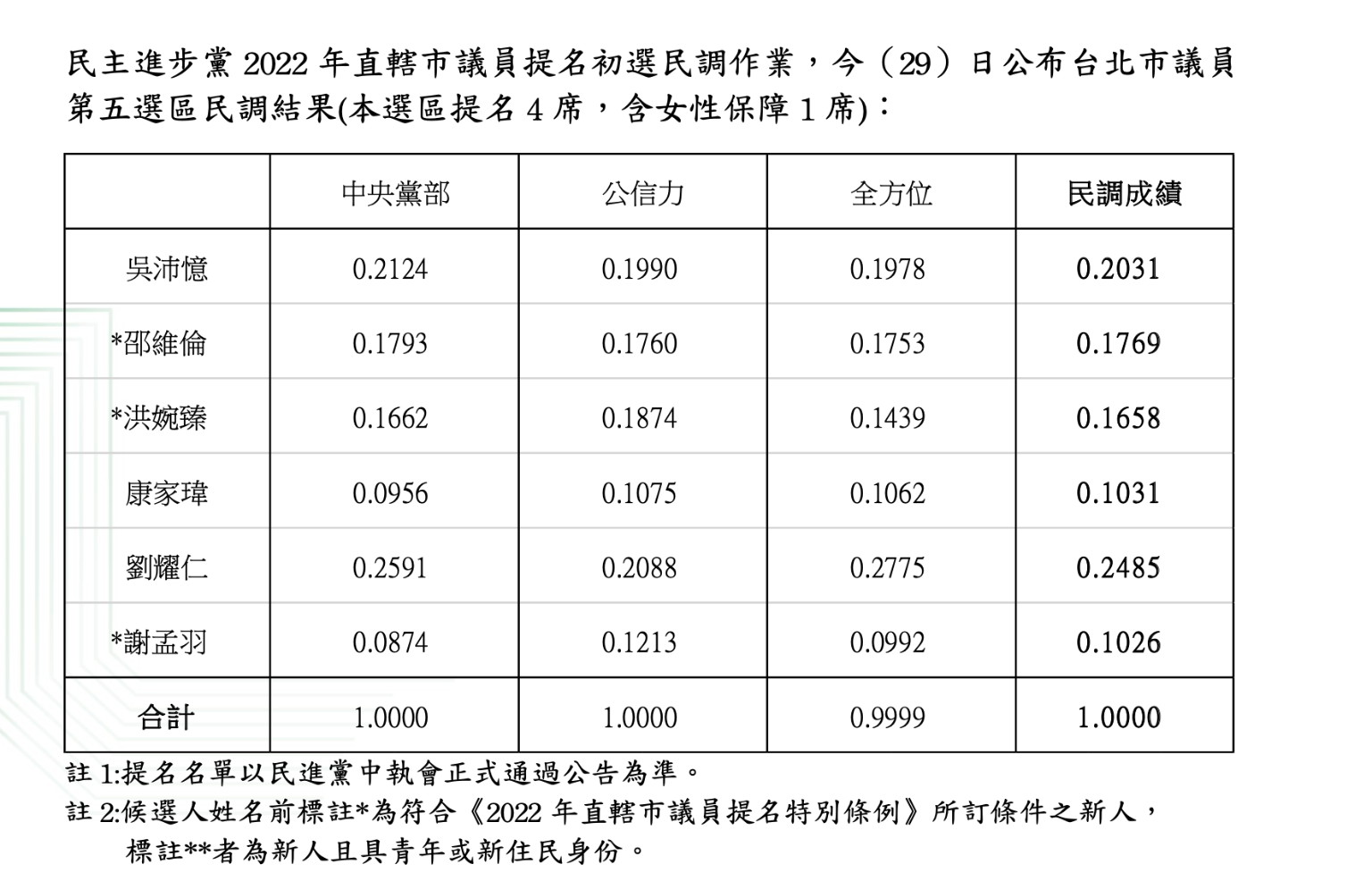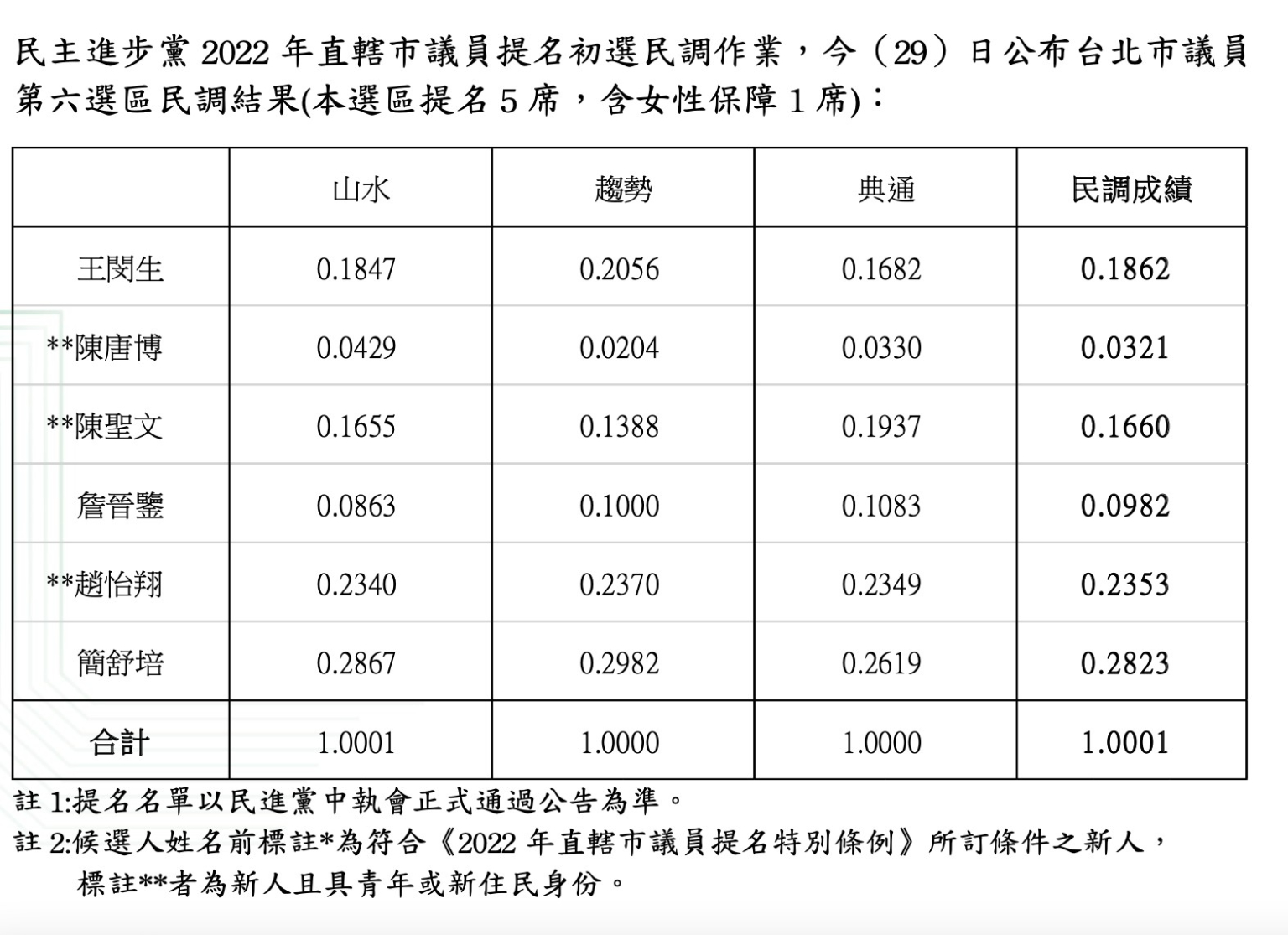 2022年地方選戰,民進黨正在進行議員初選,今(29)公布台北市第5選區(中正、萬華)、第6選區(大安、文山)初選民調結果,中正、萬華選區6搶4提名,現任議員與兩新人新系邵維倫、立委余天支持的洪婉臻出線。第6選區中,備受矚目的口譯哥趙怡翔也以初選民調第2搶下提名。