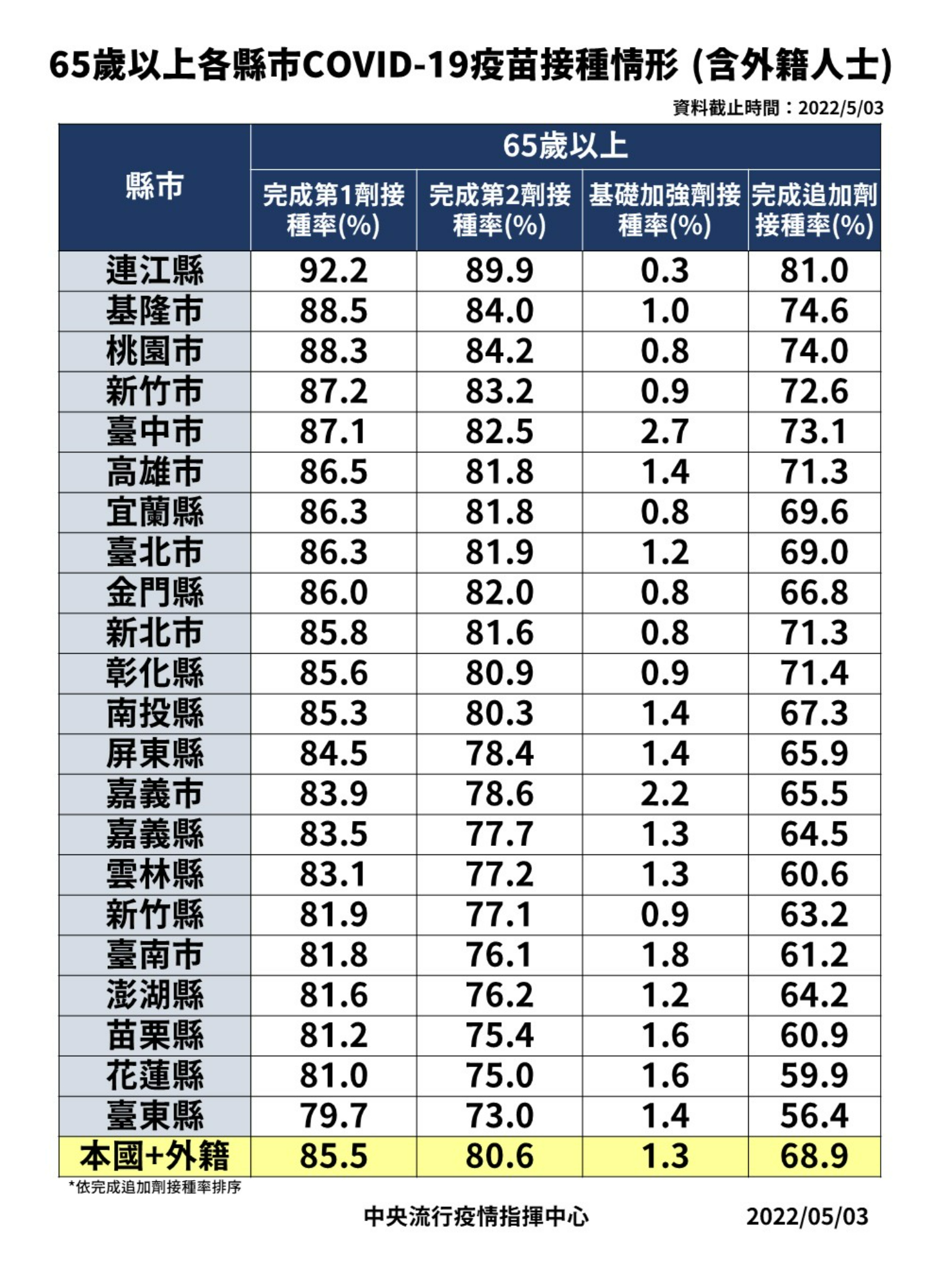再65歲以上長者疫苗接種部分,若從施打三劑疫苗的統計來看,從以下統計數據可以看出,北部苗栗縣僅60%,中南部除了台中、彰化、高雄市以外,其他中南部縣市包括雲林、南投、嘉義縣市、台南市、屏東縣、長者疫苗接種率都低於七成,普遍較低,花蓮、台東更是低於六成,台南市則是六都當中長者接種率最低的,僅有61.2%,由於中南部醫療資源相對北部貧乏,長者疫苗接種率過低,實為一大隱憂。