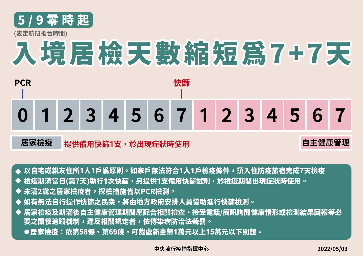 陳時中表示,考量Omicron變異株之潛伏期較短且為兼顧維持國內防疫量能、社會經濟活動及有效控管風險,自今(2022)年5月9日零時起(航班表定抵臺時間)入境居家檢疫天數縮短為7天,相關措施說明如下: