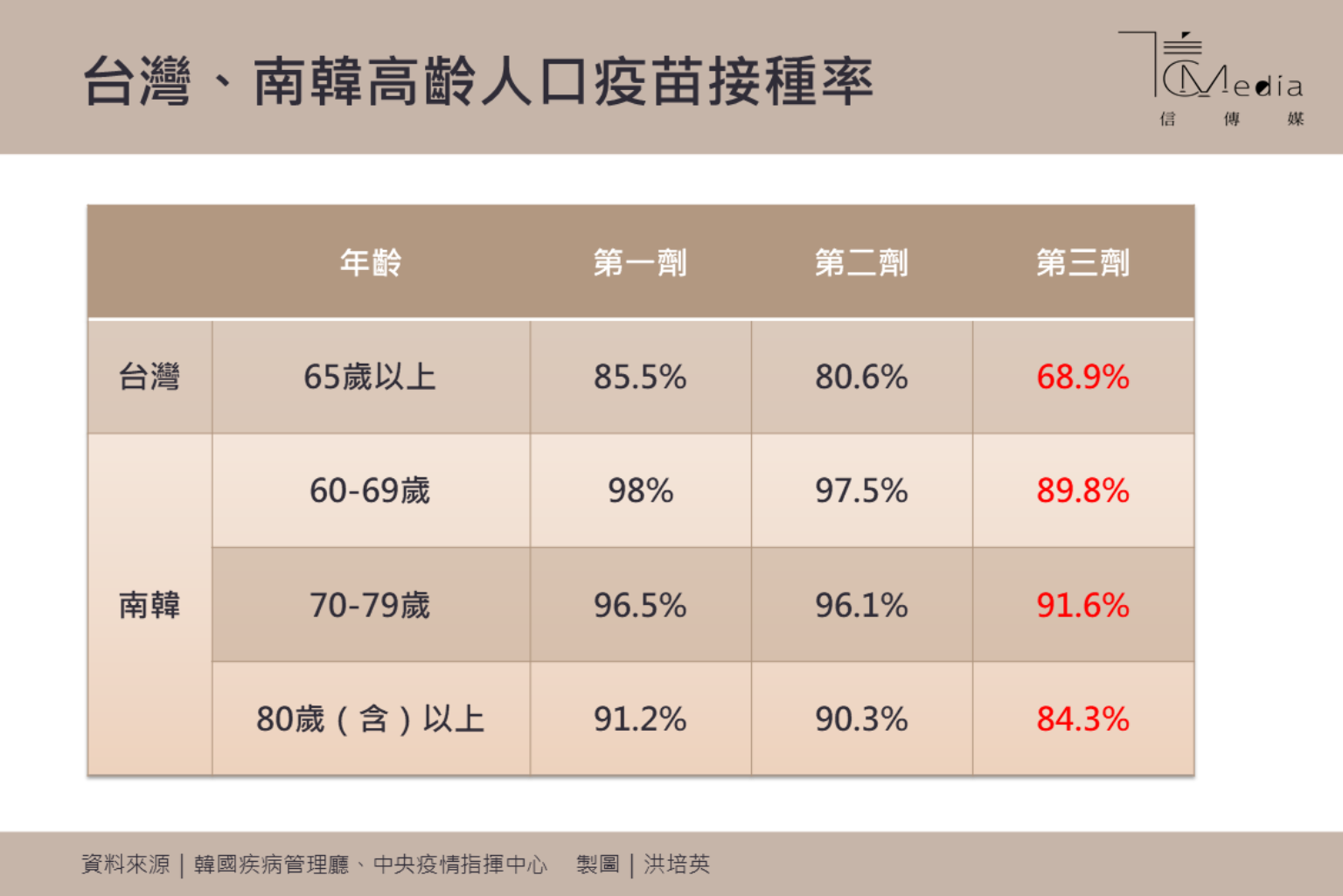 根據KDCA統計,截至4月21日,南韓60歲以上年長者第三劑接種率高達9成。而指揮中心5月3日公布的疫苗接種情形顯示,台灣65歲以上第三劑接種率約為7成。