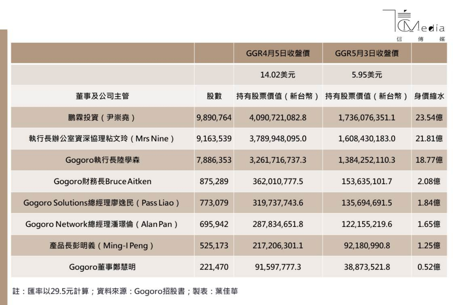 隨著Gogoro股價重挫,連帶也導致公司董事、高階主管所掌握的持股市值跟著縮水,包括鵬霖投資在短短不到一個月內,持有的股票市值已從40億台幣跌落到17億元,等於縮水蒸發了23億台幣。