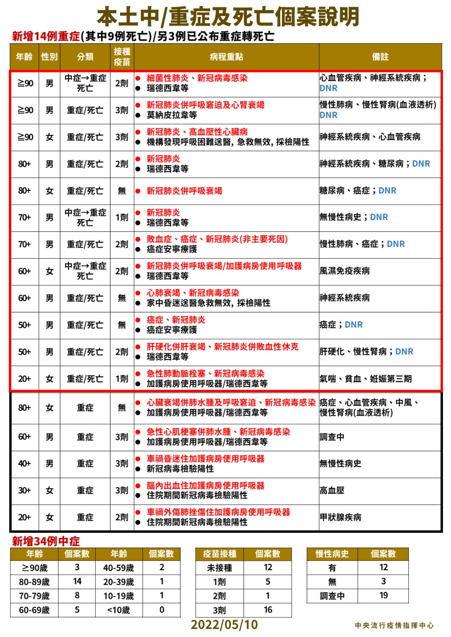 指揮中心指出,今日新增12例本土病例死亡個案,為8例男性、4例女性,年齡介於20多歲至90歲以上,皆屬重度感染個案、10例具慢性病史、3例無疫苗接種。確診日介於今(2022)年4月28日至5月8日,死亡日期介於5月6日至5月8日。