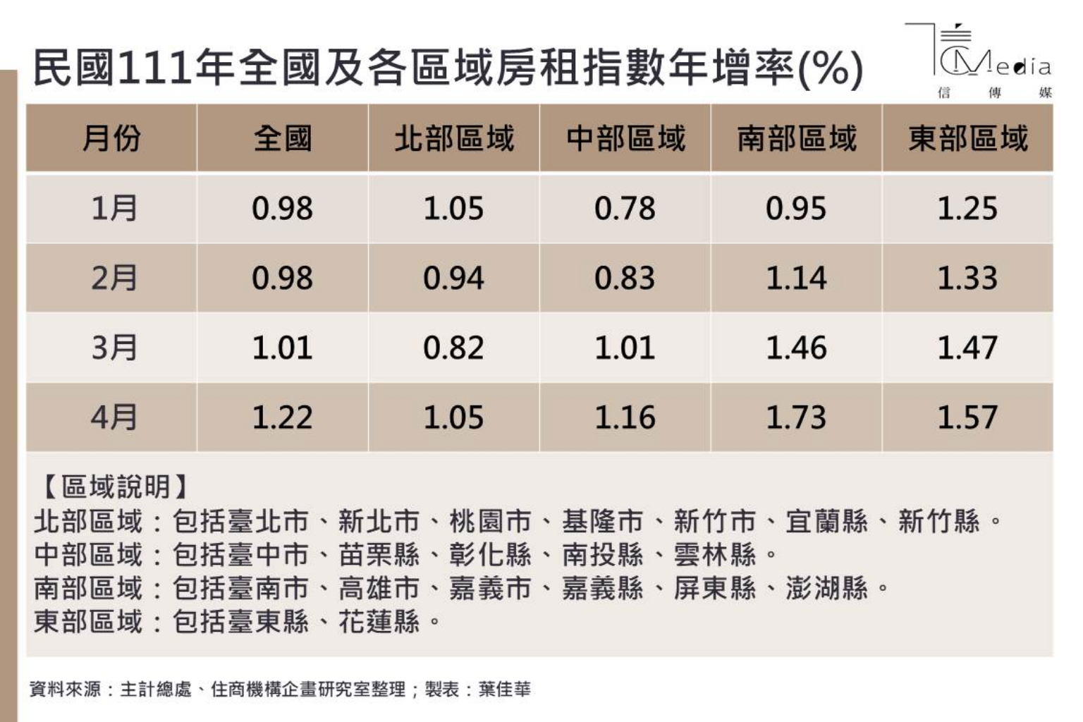 根據主計總處最新統計,今(2022)年4月消費者物價房租類指數為105.70,再創歷史新高,從北、中、南、東4大區域房租指數年增率來看,又以南部增加1.73%最多。房仲業者分析原因,南部區域近幾年房價拉升顯著,因此帶動房租年增率上揚更強於其他區域。