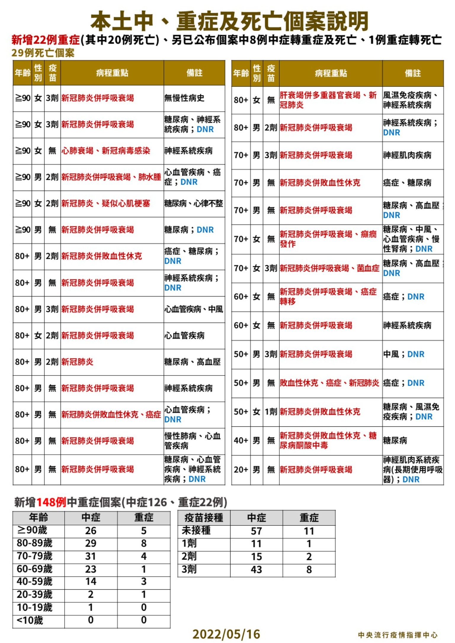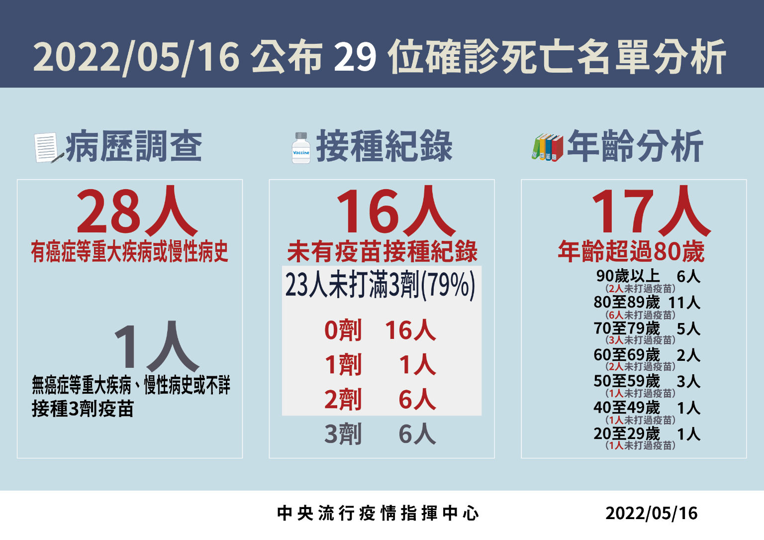 指揮中心指出,今日新增29例本土病例死亡個案,為18例男性、11例女性,年齡介於20多歲至90歲以上,皆屬重度感染個案、28例具慢性病史、16例無疫苗接種。確診日介於今(2022)年4月27日至5月13日,死亡日期介於5月6日至5月14日。