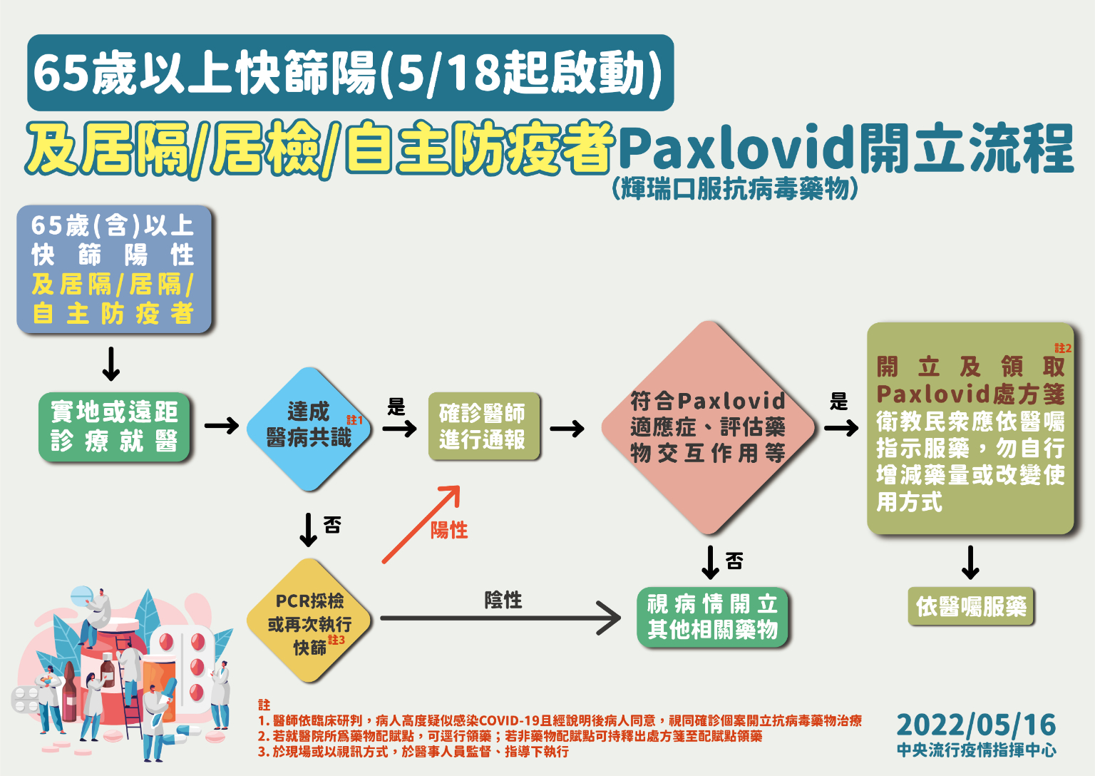指揮中心進一步說明,經醫師依病人提供之抗原快篩陽性檢驗結果與臨床研判,認定病人高度疑似感染COVID-19且達成醫病共識者,由醫師以健保IC卡上傳COVID-19檢驗結果等方式通報確診,並進行Paxlovid抗病毒藥物(輝瑞口服抗病毒藥)適應症評估;醫師經詳細說明治療效益與副作用,於取得病人或其代理人同意後,即可開立處方箋。持釋出處方箋者,由親友持前往社區藥局或Paxlovid配賦醫院領取藥品,進行治療。