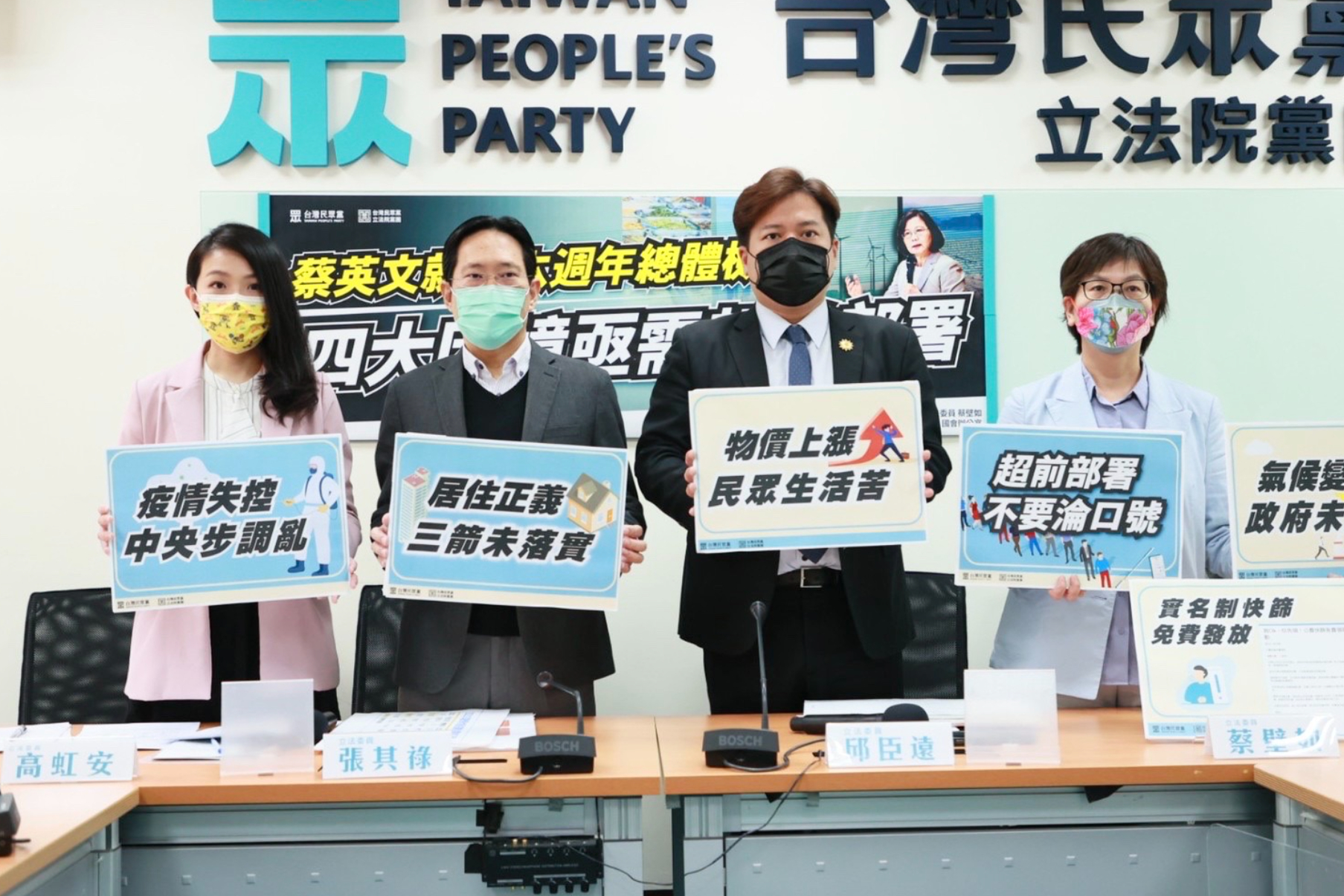 民眾黨團認為,蔡政府執政將邁向第7年,惟民生物價不斷上漲,房市3箭仍未達成,再加上防疫步調混亂,民眾生活越來越苦。