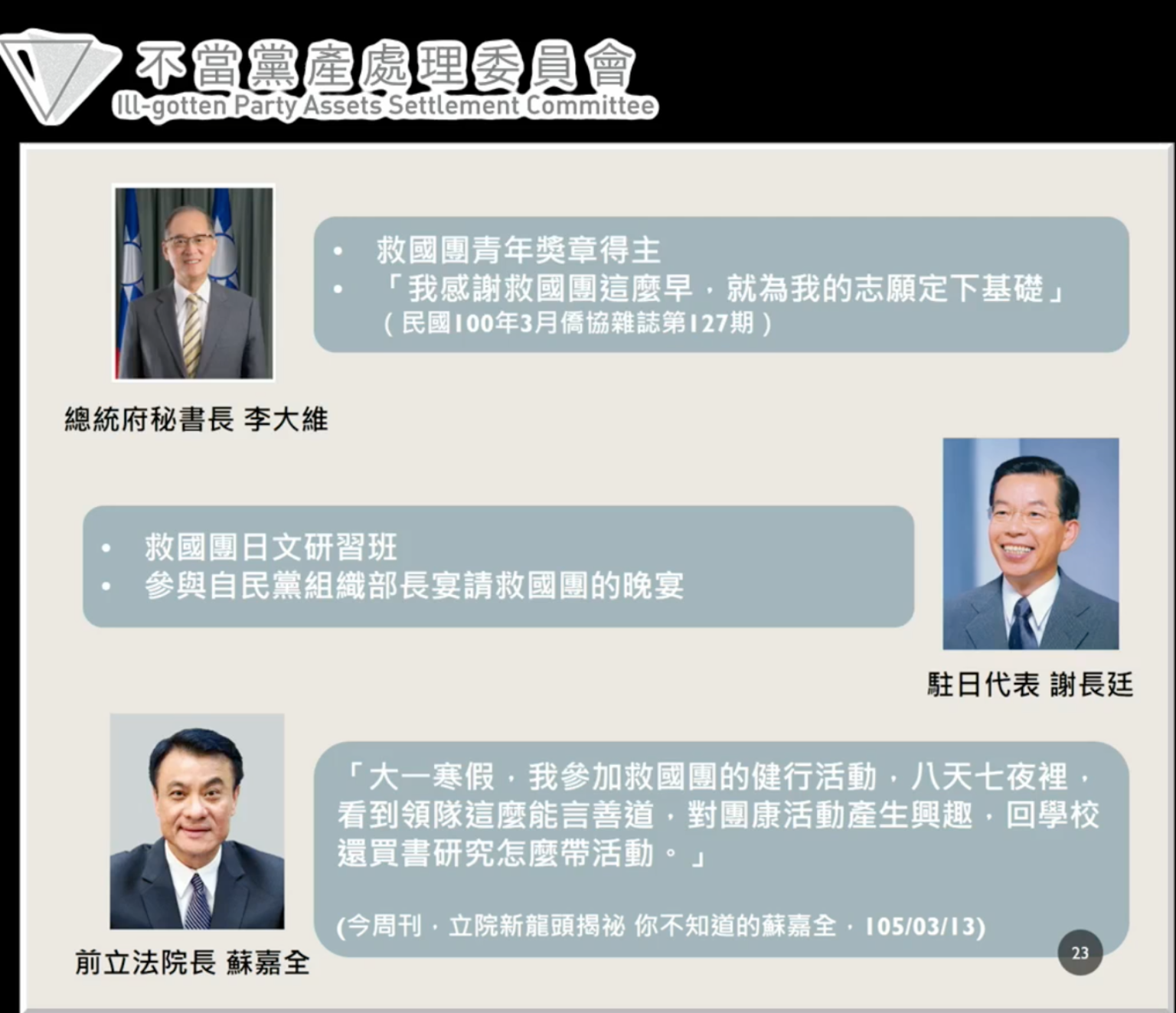 黨產會委任律師劉昌坪則秀出照片,包括蔡英文、總統府祕書長李大維、蘇嘉全、謝長廷、甚至前黨產會副主委、現任監察委員施錦芳等都曾參加過救國團活動,他認為這些人並不是因遭受政治脅迫才參加,而是認同救國團的宗旨。
