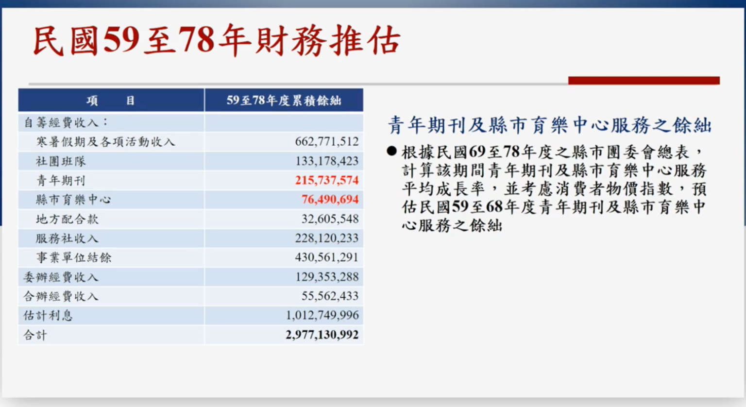 余景仁表示,推估59年到78年的財務,自籌收入包含寒暑期假期及各項活動收入6億6277萬餘元、社團班隊收入1億3317萬餘元、青年期刊2億1573萬餘元。另外加上委辦、合辦收入,以及估計利息10億1274萬餘元後,合計約29億7713萬餘元。