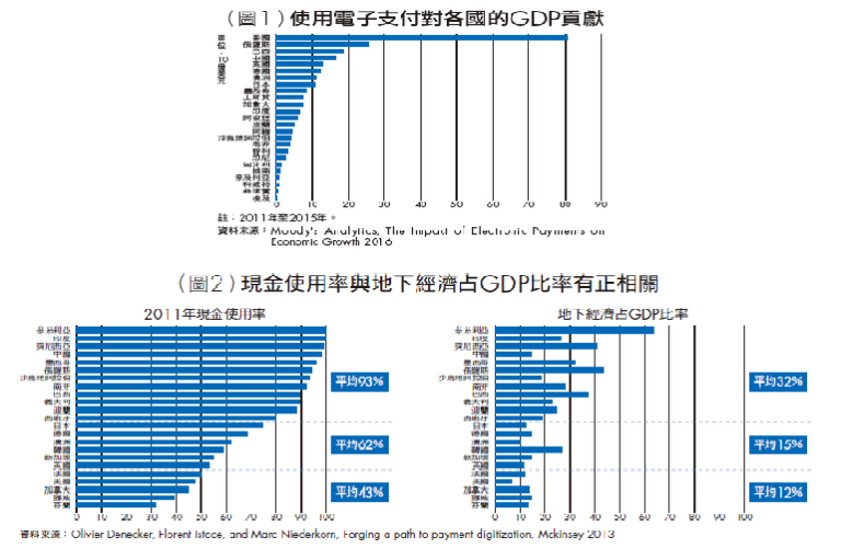 經濟學家FriedrichSchneider的研究指出,越普遍採用電子支付的國家,其地下經濟的規模越小,假設能平均每年增加10%的電子支付使用,連續4年後,就可縮小5%的地下經濟規模;McKinsey的研究報告也顯示,現金使用率與地下經濟占GDP比率有正相關(詳見圖2)。