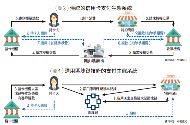 長期而言,我們則必須關注區塊鏈的技術對支付產業的衝擊,區塊鏈具有不可修改及去中心化的特色,應用於支付領域有助於降低支付節點。傳統的信用卡支付生態系統(詳見圖3),交易過程中的發卡機構、轉接網路機構、收單機構都會收取交易手續費。