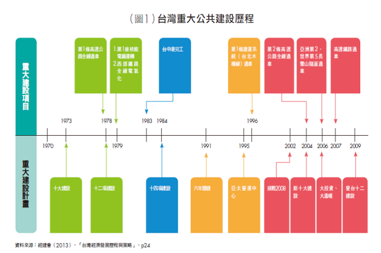 回顧我國基礎建設的發展歷程,是以1974年至1979年間所進行的「十大建設」,做為我國重大公共建設計畫的開端。在十大建設中,有6項是交通運輸建設,3項是重工業建設,1項為能源項目建設,總花費估計在新台幣2,000億至3,000億之間。其中雖也有如蘇澳港此類在興建完成後,使用效率不彰的案例;但就整體而言,各項交通與工業計畫,咸論對於當時因石油危機造成的經濟不景氣,有效的提升了國內需求,也藉由十大建設中的現代化交通設施與電力提供,強化台灣產業的國際競爭力。