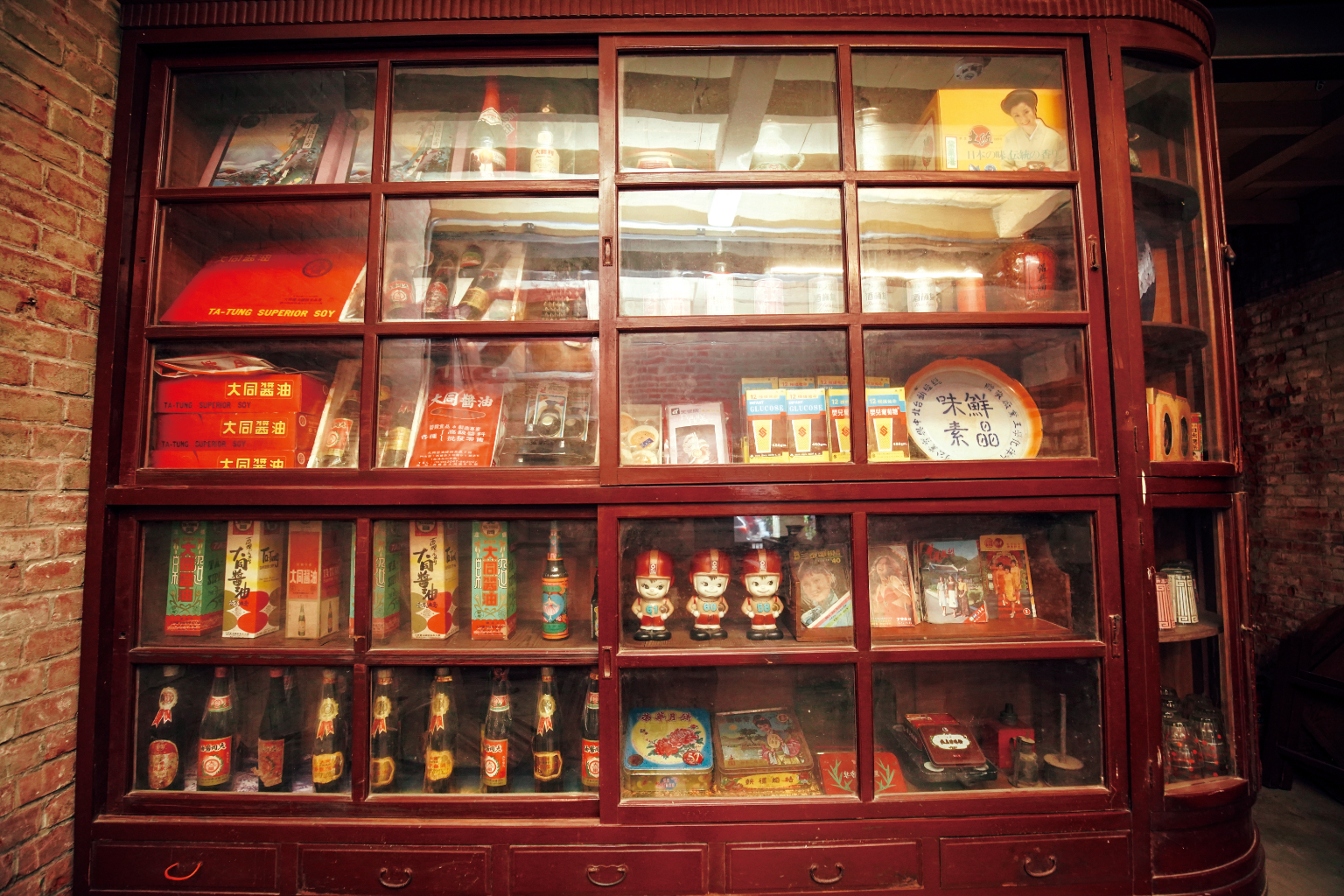 穿越源成發前半部分,樓梯後側的高3公尺、寬2公尺的巨型展示櫃陳列著各式各樣的商品,飲料、酒品、兒童用奶粉、醬油……民生用品都整齊的排列於玻璃櫃中,復古、充滿年代感的外包裝引逗出當時源成發生意興隆的回憶。這些家私塵封了數十年的時間,在屋主的整理下,一點一滴的重現於世人面前。