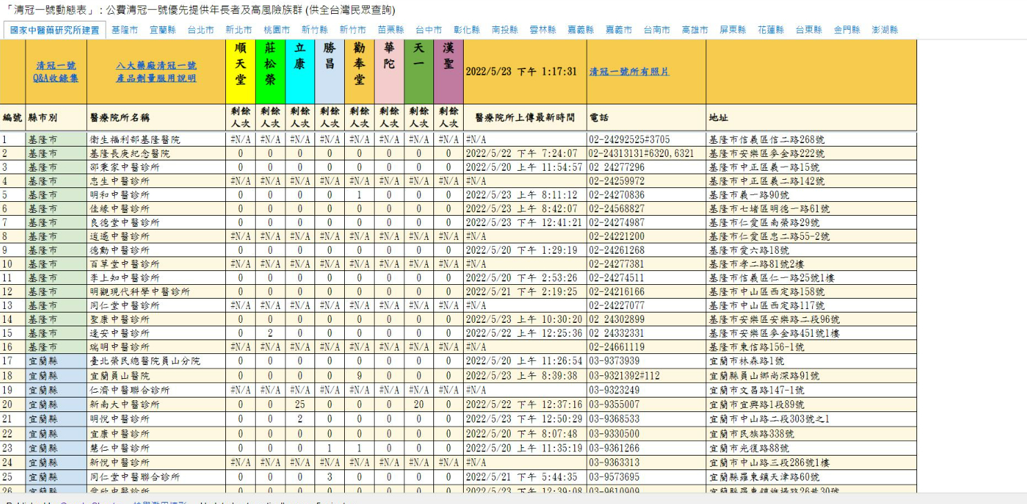「公費清冠一號動態查詢表」,由各地中醫師主動上傳資料,即時更新,民眾打開網址,只要點選所在的縣市,馬上就可以看到可以視訊診有清冠一號的中醫院所庫存,幫助民眾更快掌握清冠一號資訊。