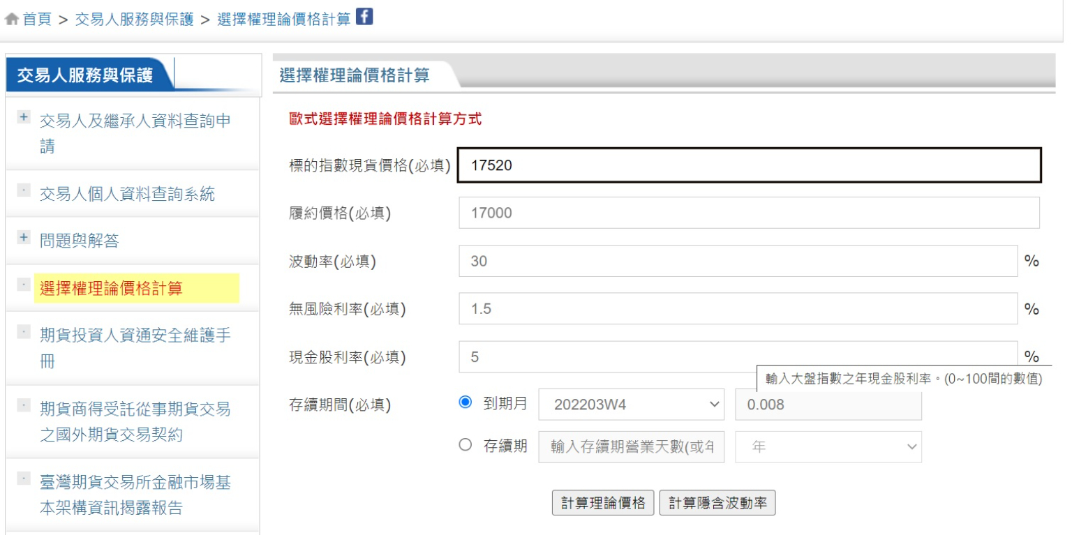其實,臺灣期貨交易所的官方網站,就有提供選擇權價格的試算,輸入一定的參數,便算出合理的價格。