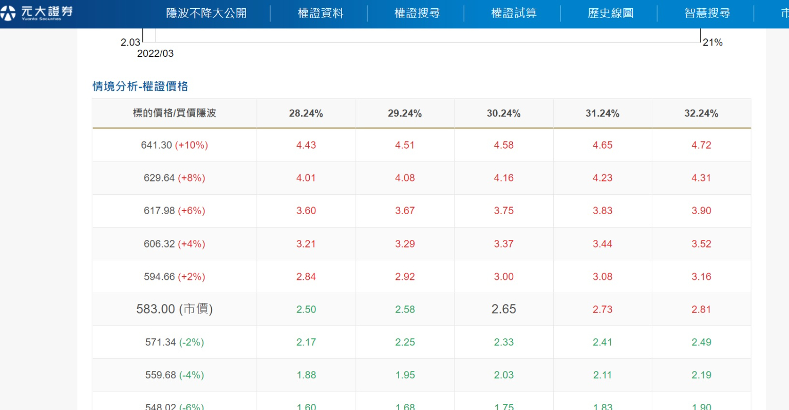 再往下可以看到「情境分析-權證價格」表格,反映出在相同的隱含波動率之下,當台積電漲到多少價格、跌到多少價格,合理的「台積電國票19購11」價格是多少。而且在相同的台積電價格之下,當隱含波動率變高了、變低了,合理的「台積電國票19購11」價格是多少。
