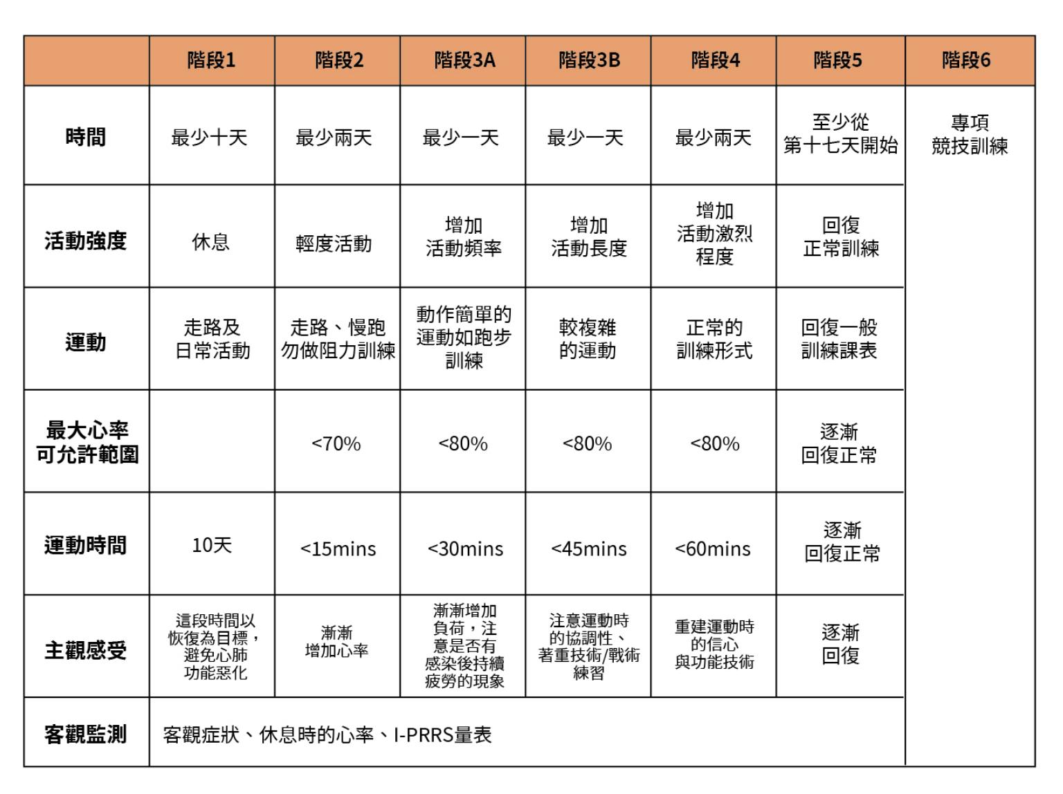 運動員必須能夠完成日常生活活動,且在平地上行走500米,不會過度疲勞或呼吸困難,才能進入下列評估流程,循序漸進過渡到正常訓練。