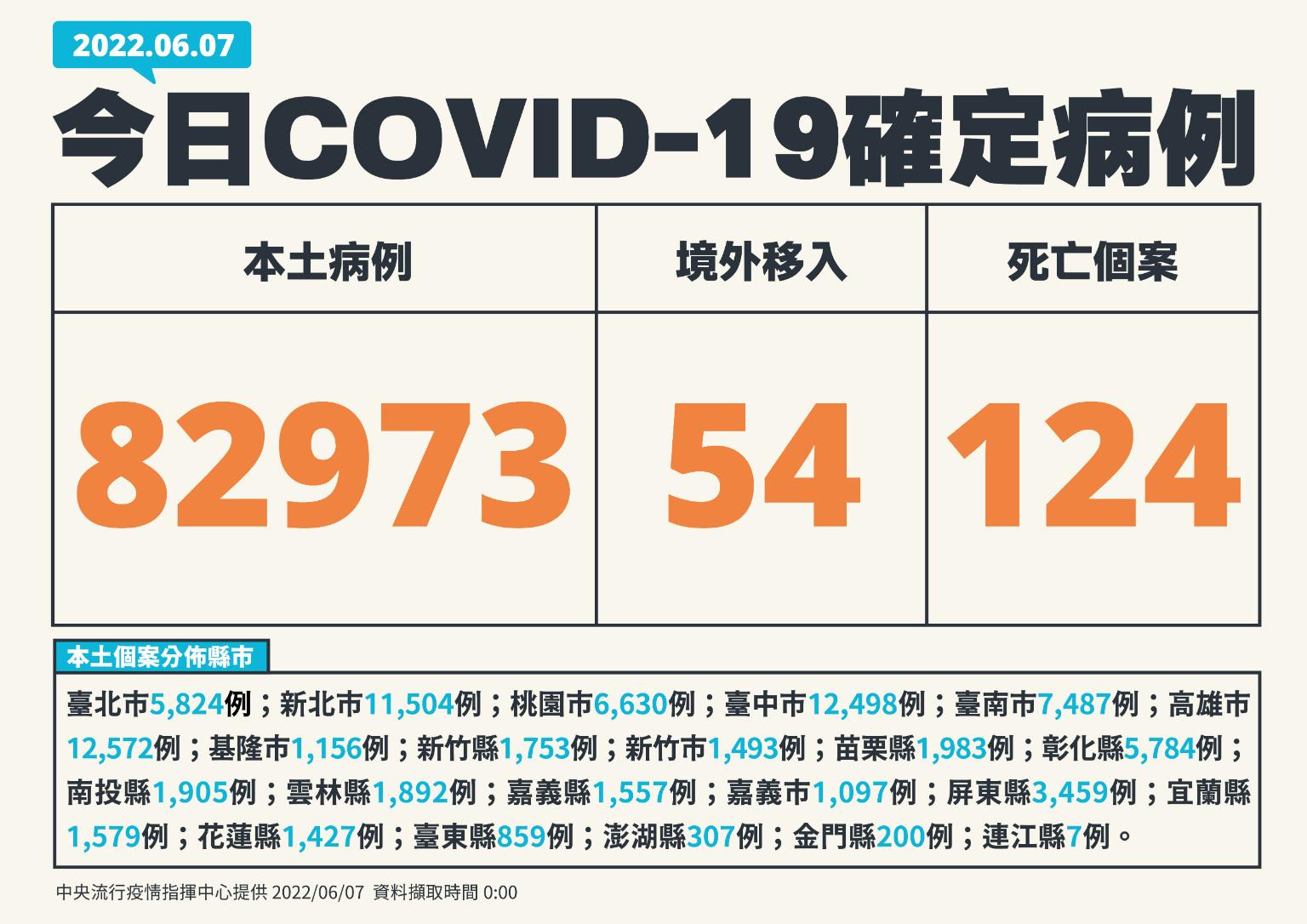 中央流行疫情指揮中心今(7)日公布國內新增83,027例COVID-19確定病例,分別為82,973例本土個案及54例境外移入;另確診個案中新增124例死亡。