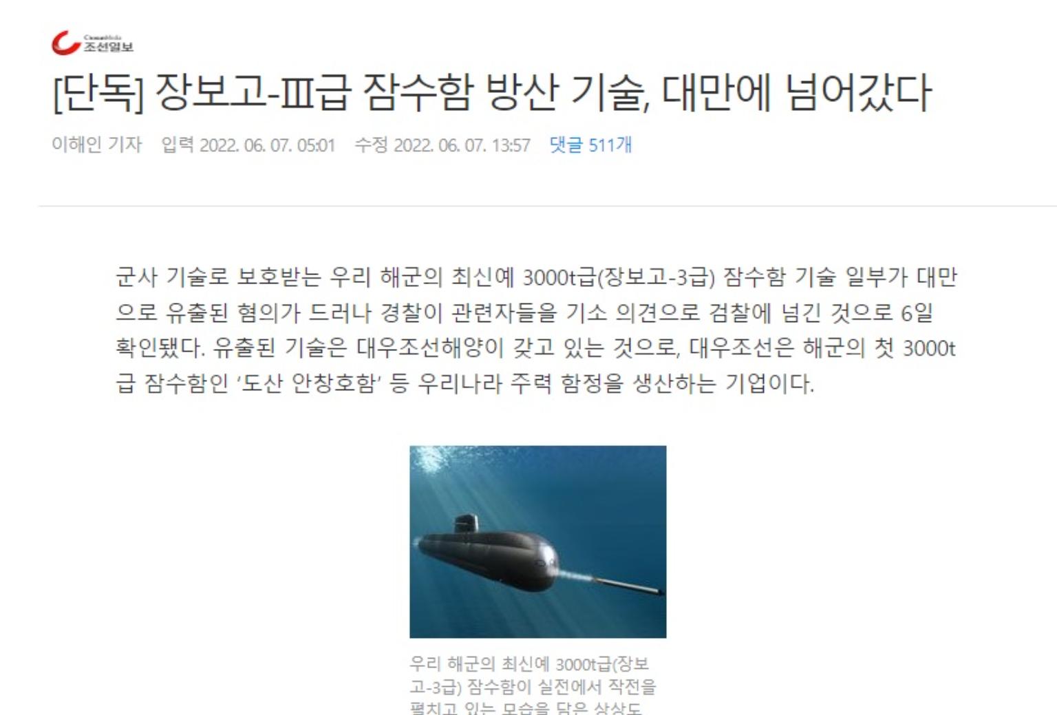 南韓媒體「朝鮮日報」7日報導,韓國一家造船業與台灣簽署一份1500億韓元 ( 約35億新台幣 )合約 ,同時派遣20名員工、包括有15名韓國大宇造船潛艇事業部的前職員到台灣,這些大宇造船前員工洩露大宇造船海洋工程公司保有的部分韓國最新型「張保皋」III(Jang Bogo-III,KSS-III)級潛艦技術。