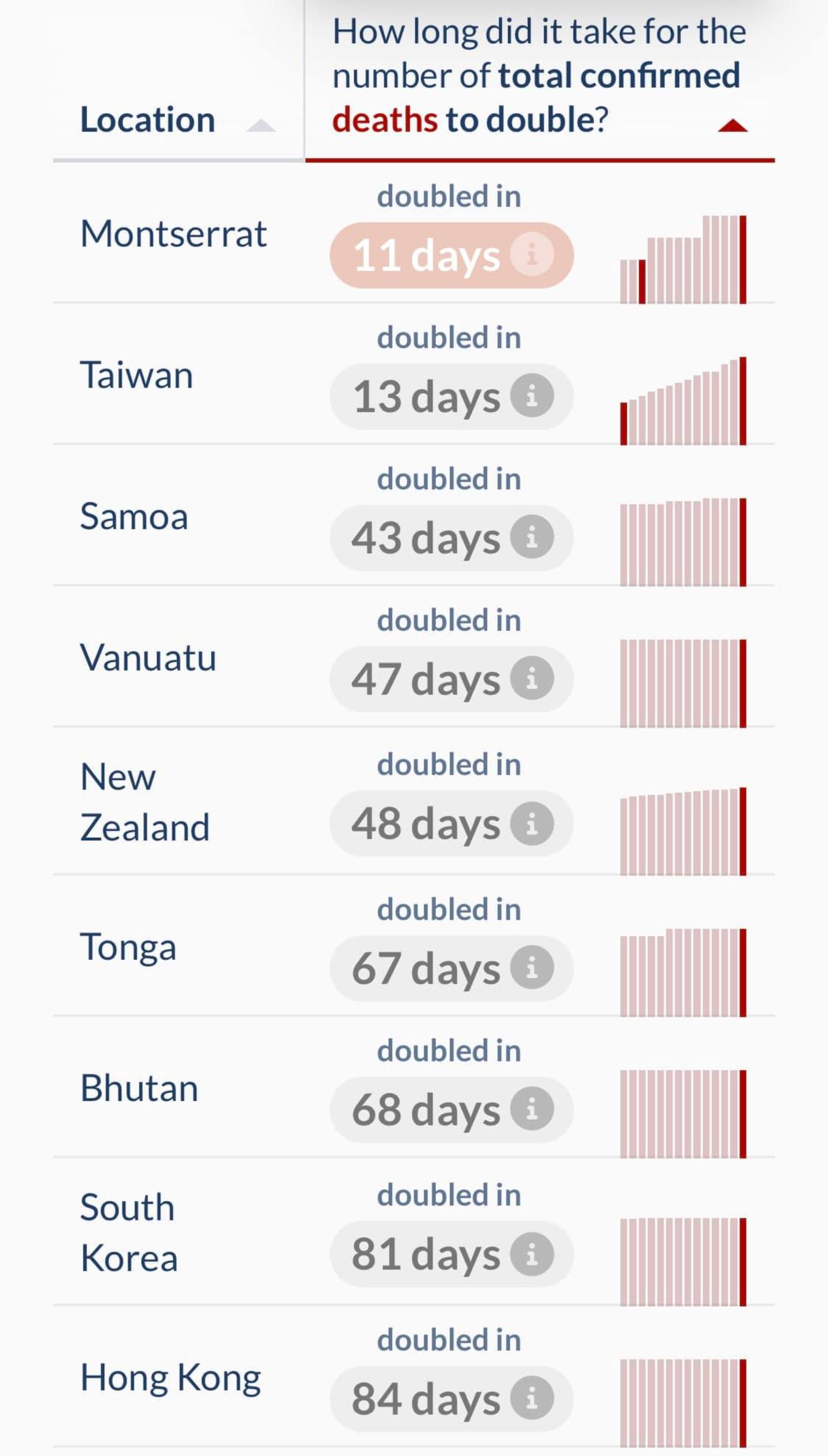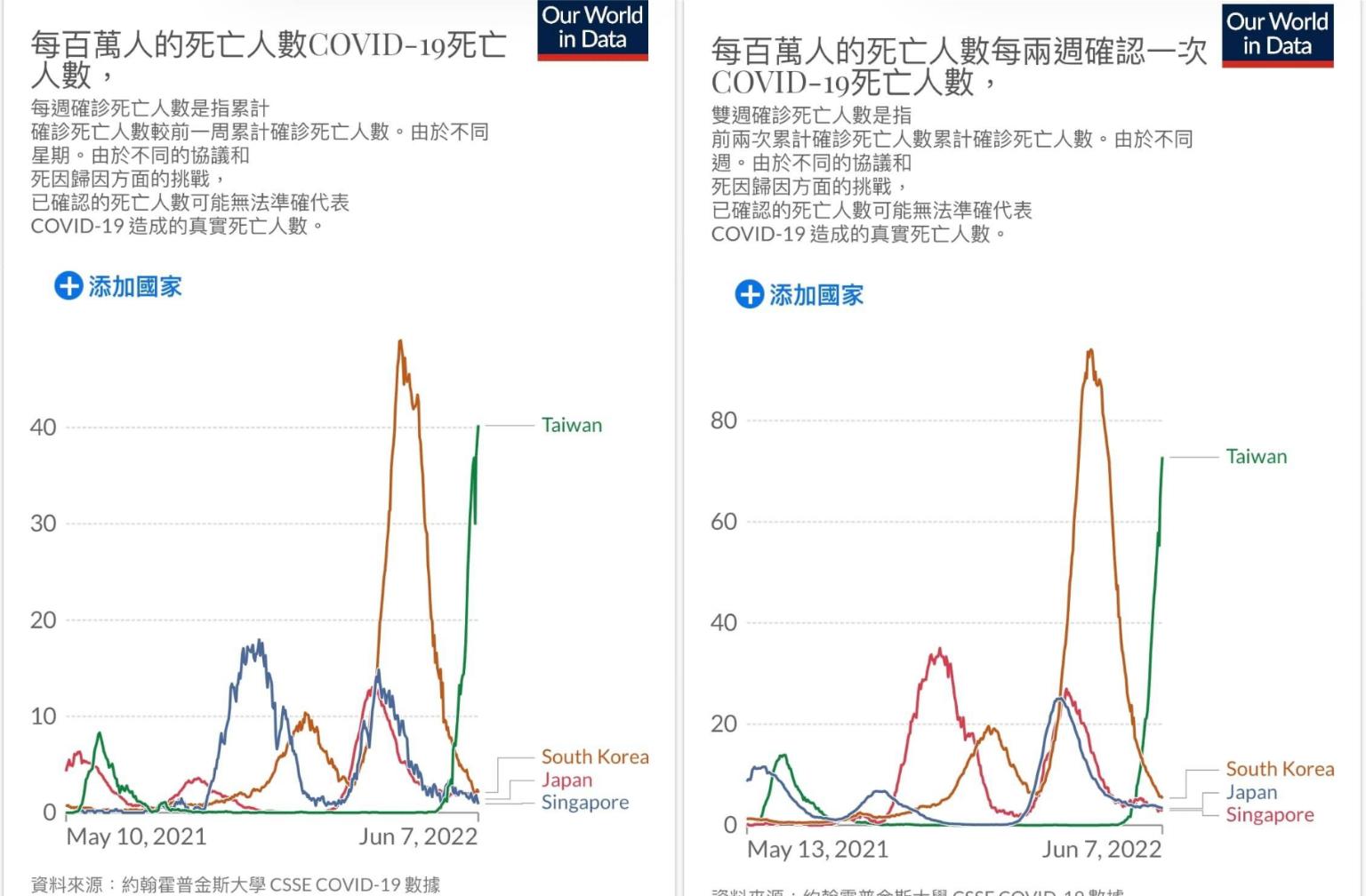 依照2022年6月7日ourworldindata資料顯示:目前台灣新冠死亡數倍增速度是全球第二快,死亡數翻倍時間:台灣約13天,韓國約81天,新加坡約192天,日本約298天。