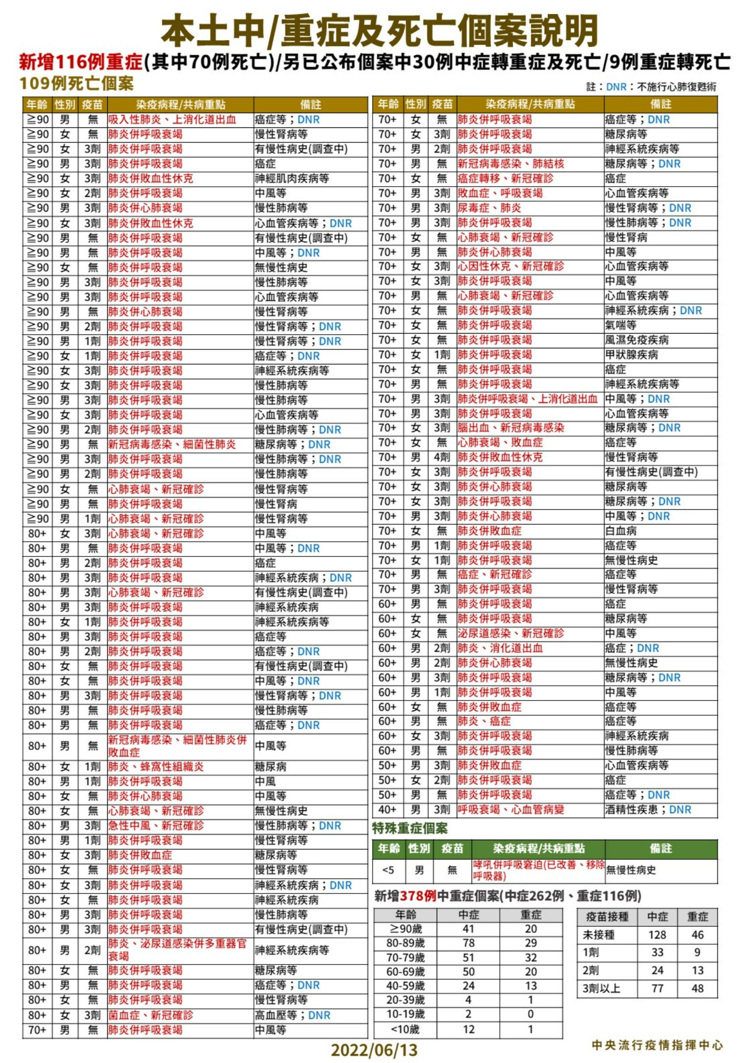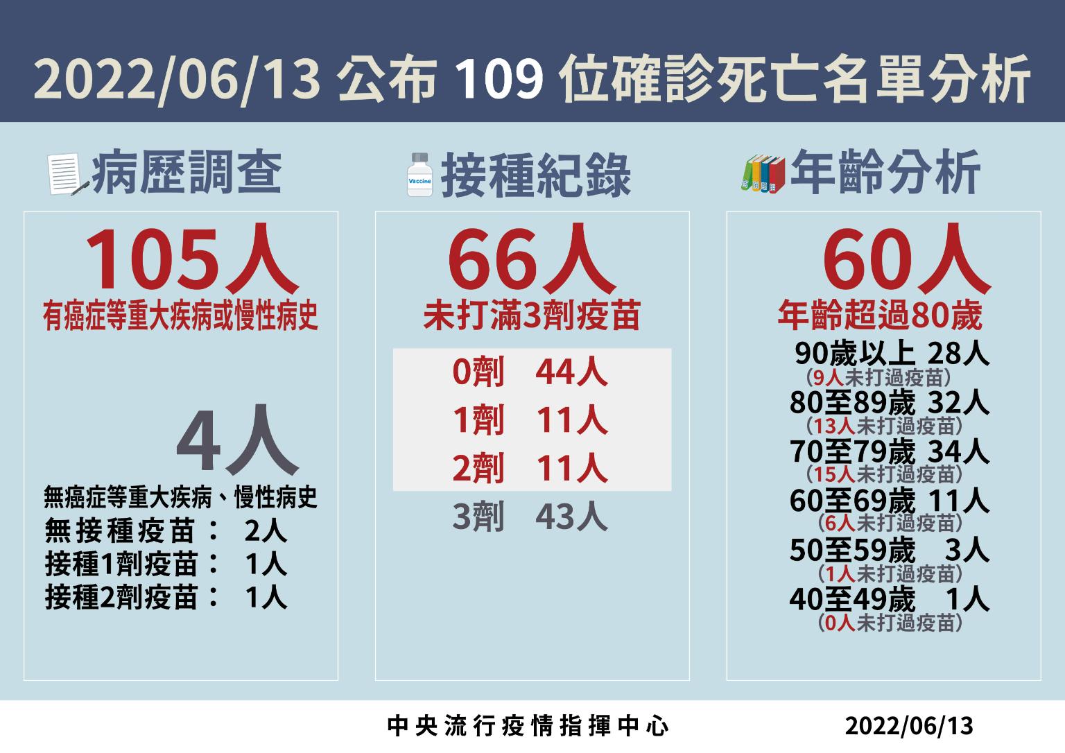 周志浩指出,今日新增109例本土病例死亡個案,為61例男性、48例女性,年齡介於40多歲至90多歲以上,皆屬重度感染個案、105例具慢性病史、66例未接種3劑 COVID-19疫苗。確診日介於今(2022)年5月4日至6月9日,死亡日期介於5月19日至6月10日,詳如新聞稿附件。