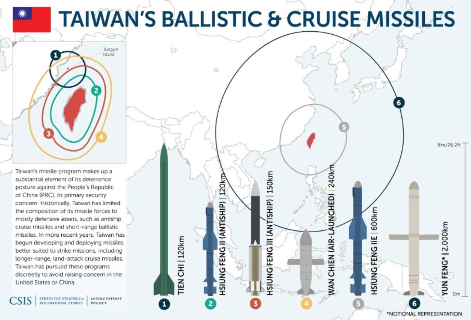 美國「戰略暨國際研究中心」智庫曾披露雲峰飛彈(右一)相關資訊。(圖片來源/擷自CSIS網頁)此外,還有增程型雄二E、戟鋒飛彈、增程型弓三、增程型天弓二B、空射式雄三等飛彈。