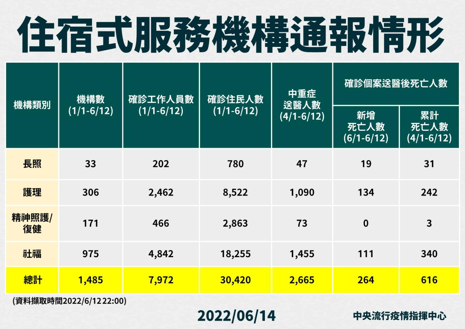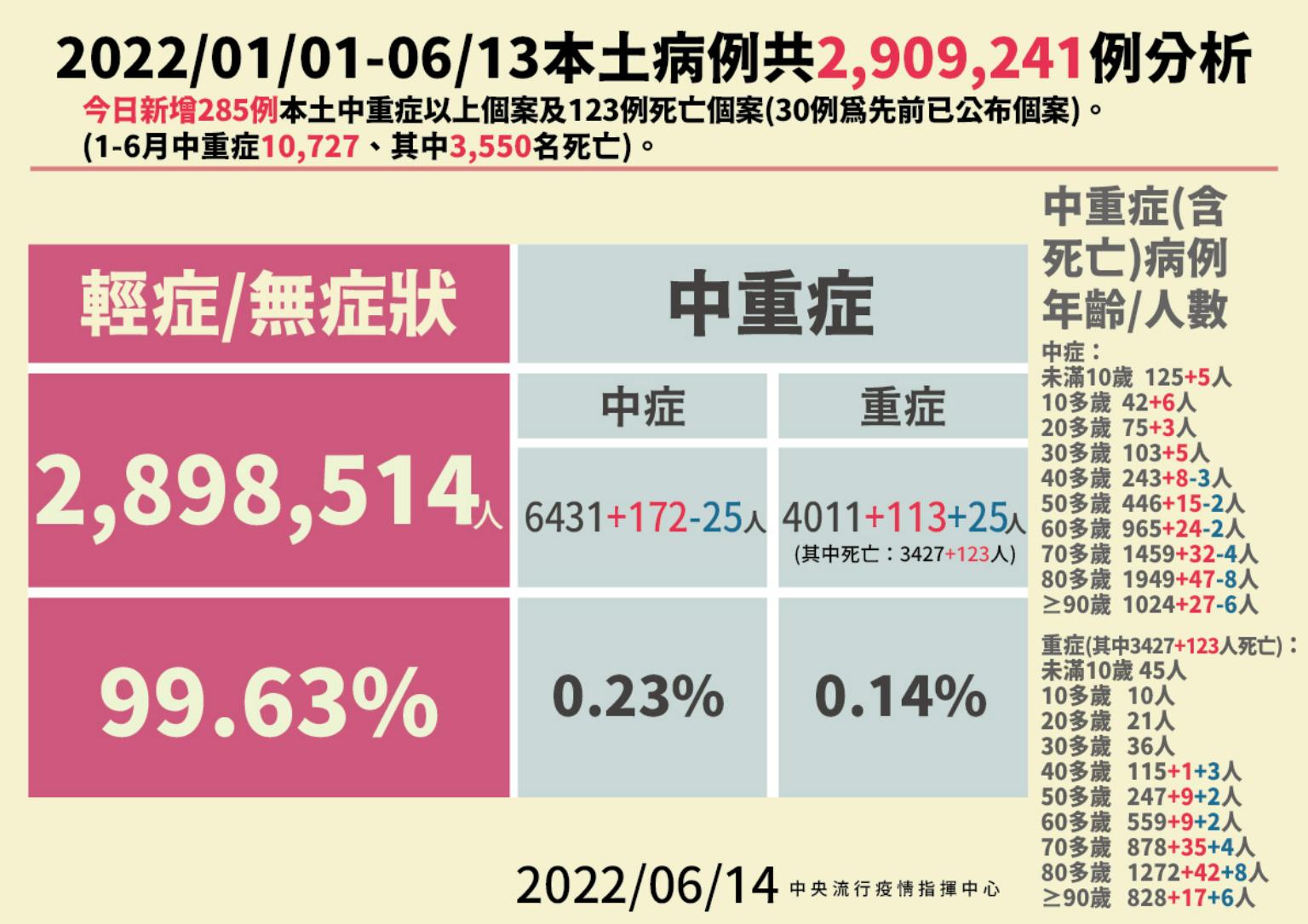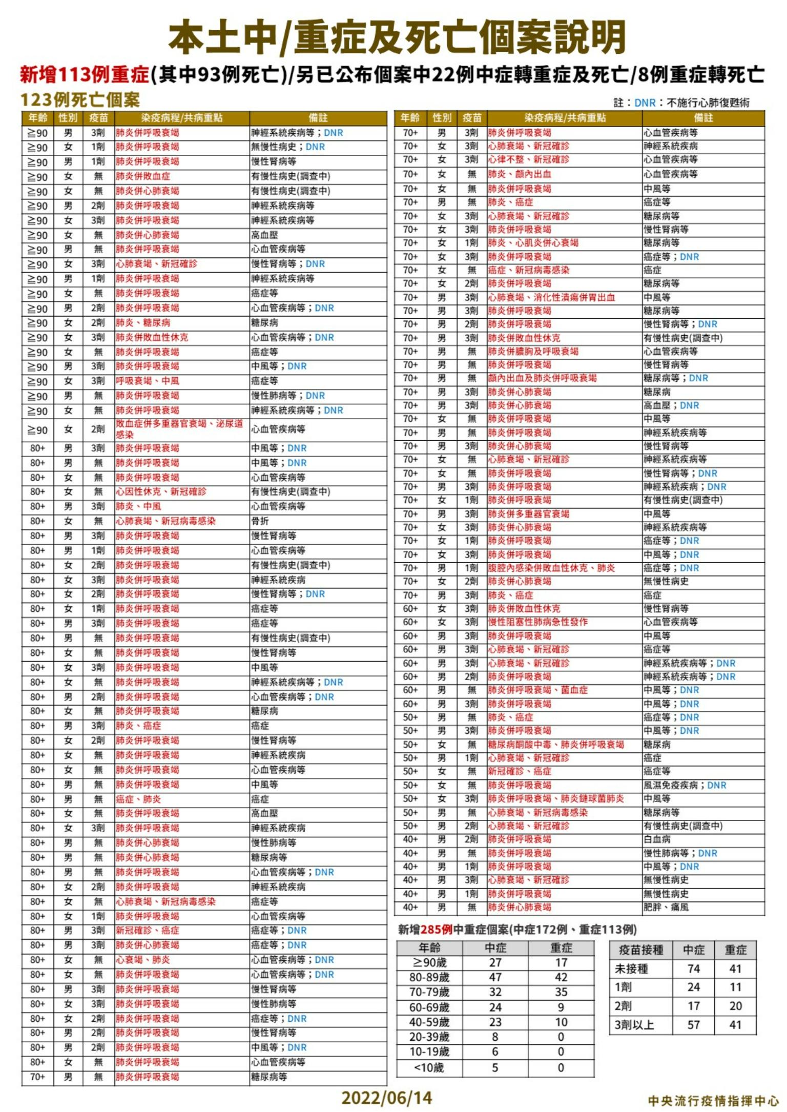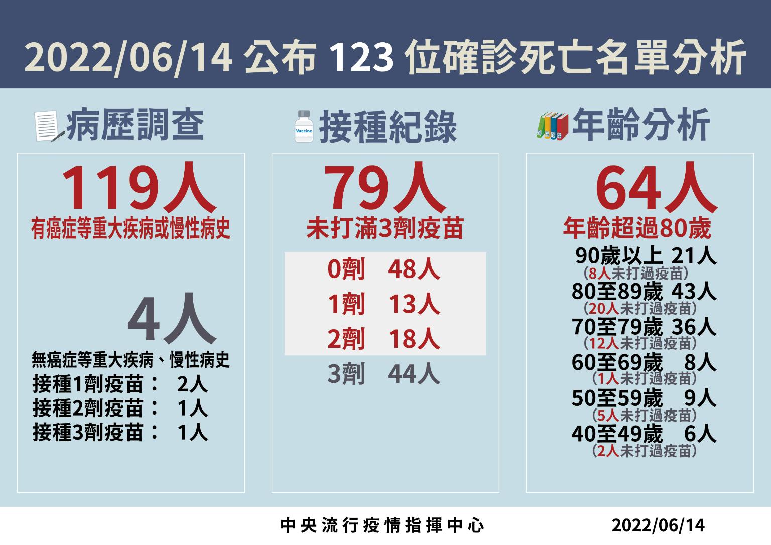 周志浩指出,今日新增123例本土病例死亡個案,為62例男性、61例女性,年齡介於40多歲至90多歲以上,皆屬重度感染個案、119例具慢性病史、79例未接種3劑COVID-19疫苗。確診日介於今(2022)年5月3日至6月12日,死亡日期介於5月21日至6月12日,詳如新聞稿附件。