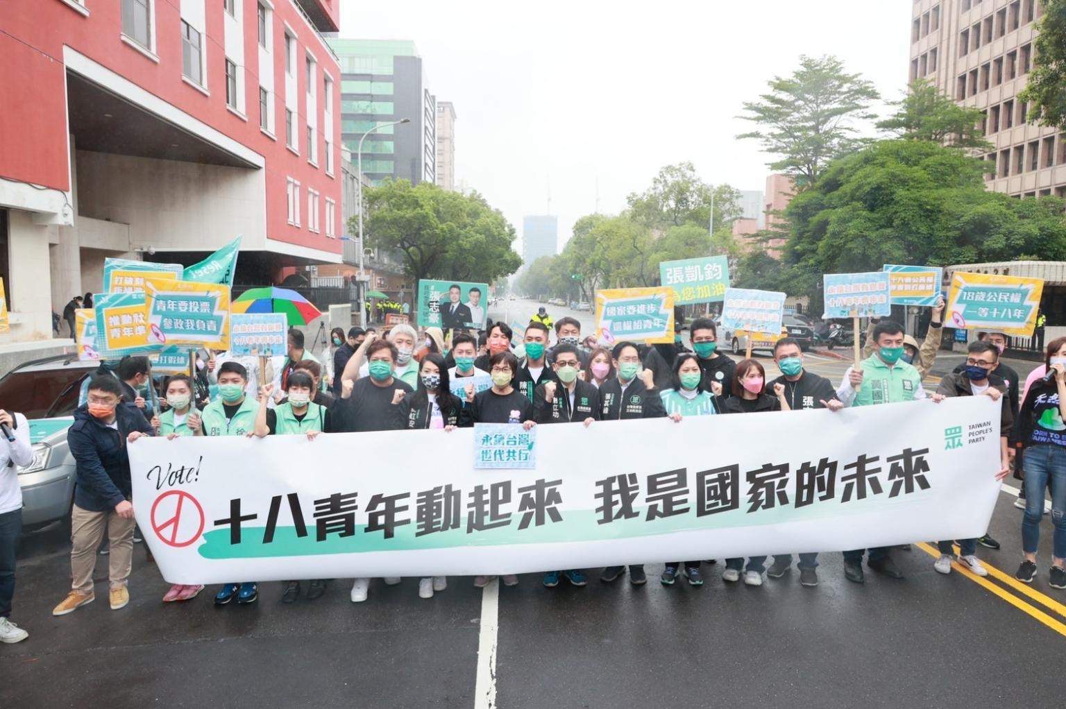 民眾黨舉辦「十八青年動起來,我是國家的未來」活動情形。(圖片來源/擷自民眾黨臉書)民眾黨接著於5月3日舉行「十八青年動起來,我是國家的未來」—挺18歲公民權齊步走活動,由立法院步行1.8公里到中選會,像徵該修憲法經倡議18年後,終於有機會落實真正還政於青年。