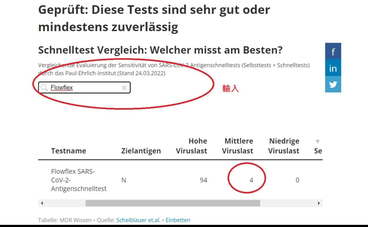 輸出的比較表格,最左邊是公司名稱、產品名稱,主要有幾個欄位,例如欄位「hohe viruslast」下面的數字表示對高含量病毒樣本的測試敏感度(可視為準確率),越高越好。「mittlere viruslast」近於平均值的病毒含量者的測試敏感度,越高越好。欄位「niderige viruslast 」低病毒含量者的測試敏感度,越高越好。