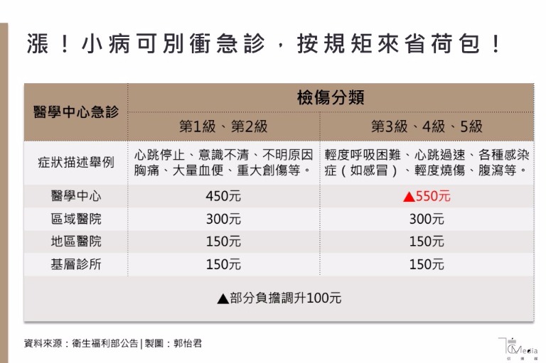另外,急診檢傷分類為3、4、5級輕症者,部分負擔也調升100元。