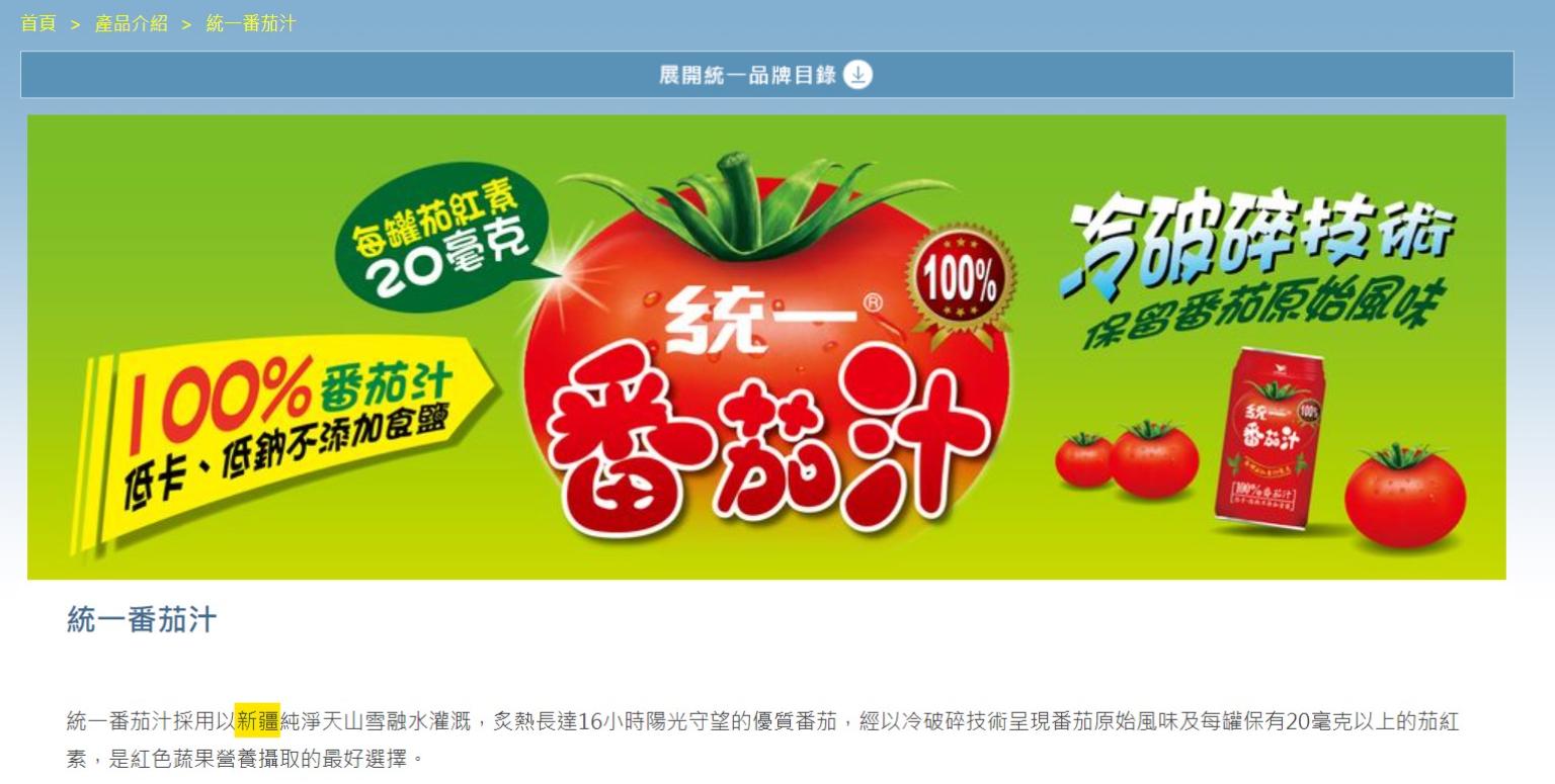 統一番茄汁標榜使用「新疆番茄」