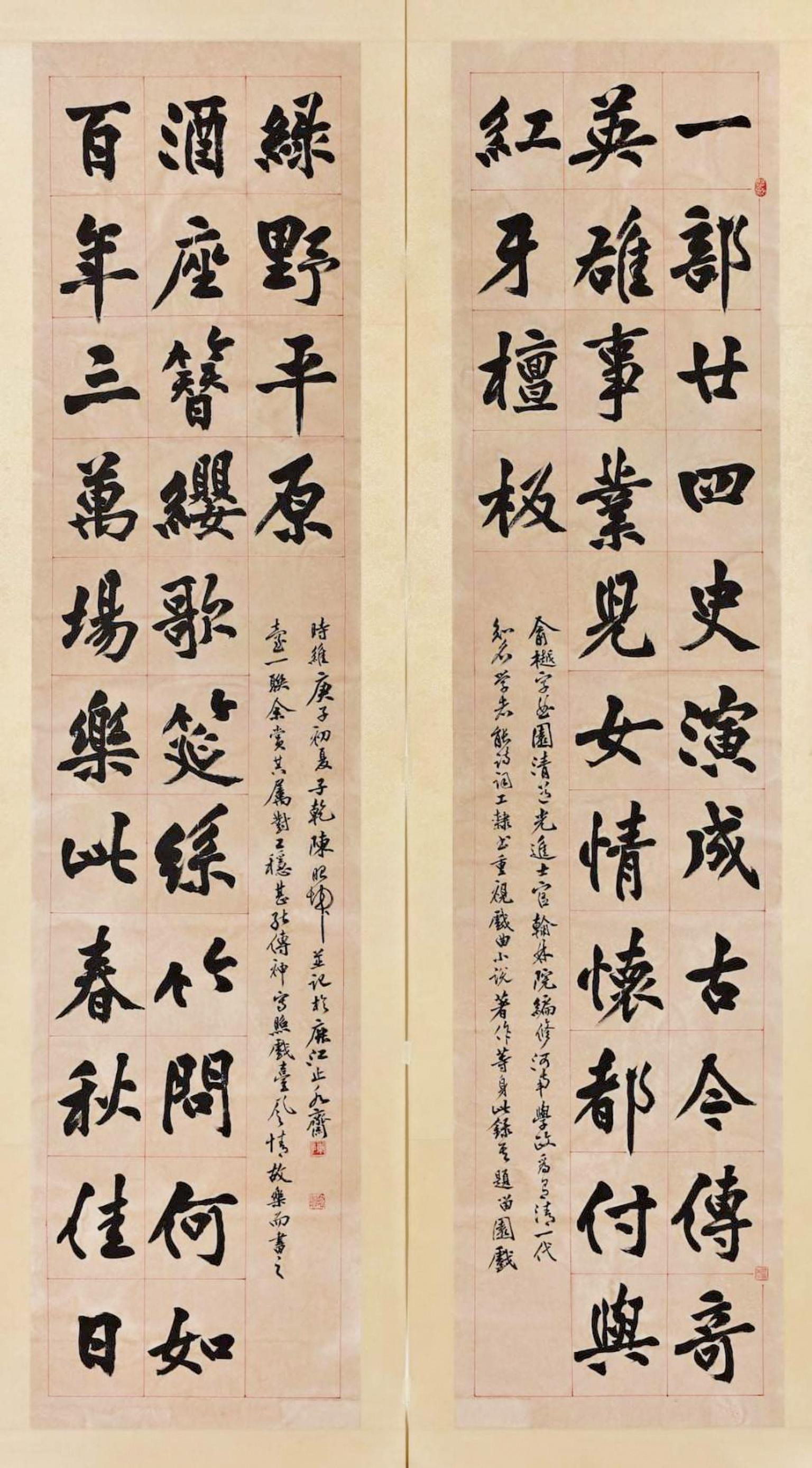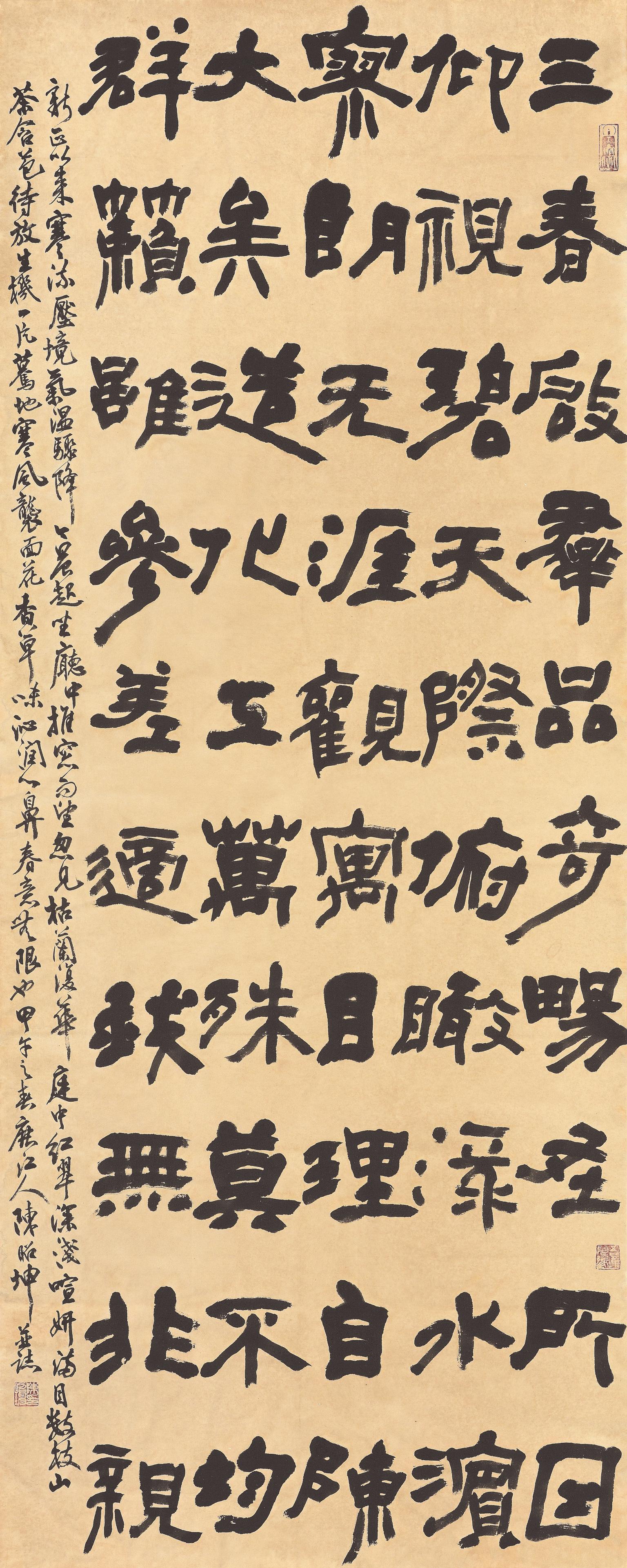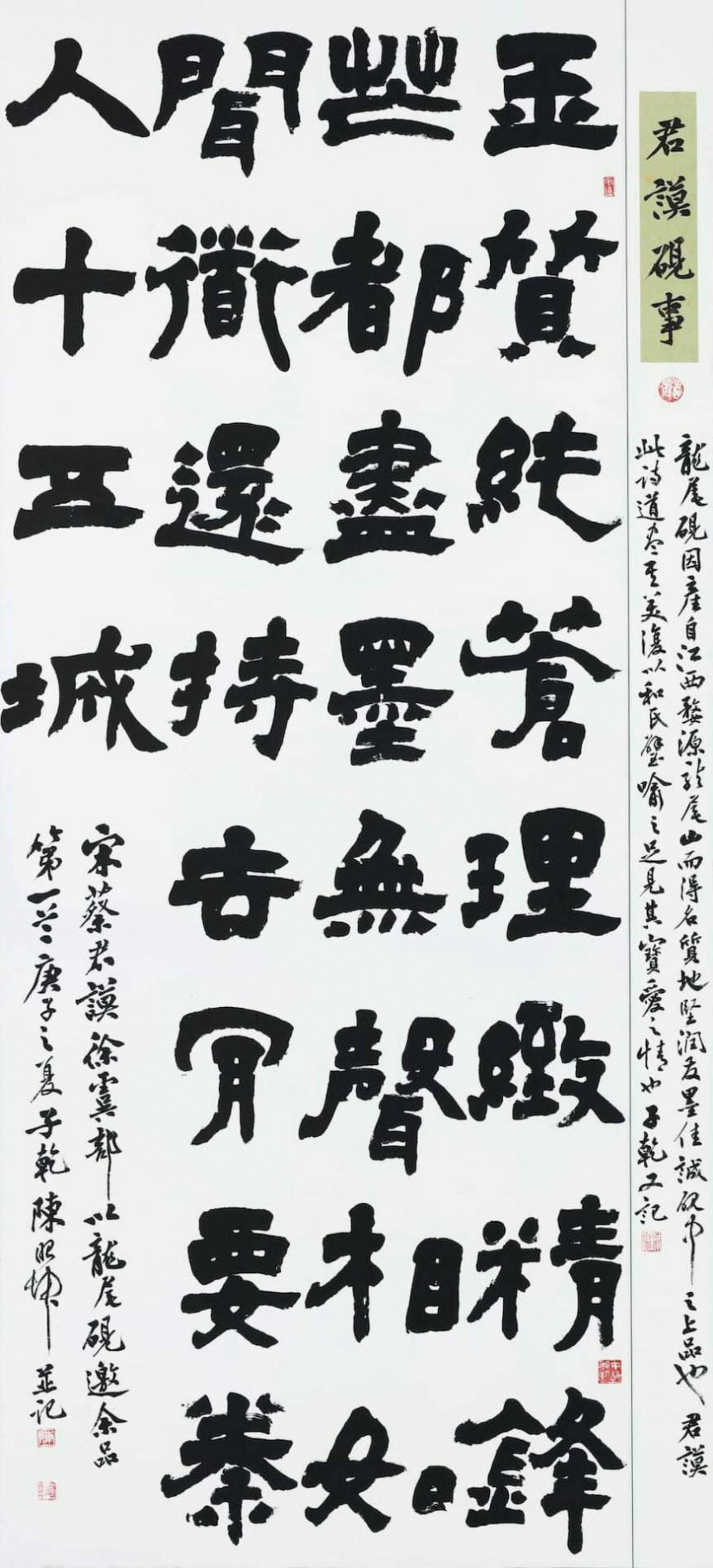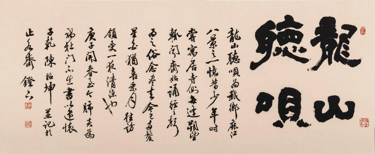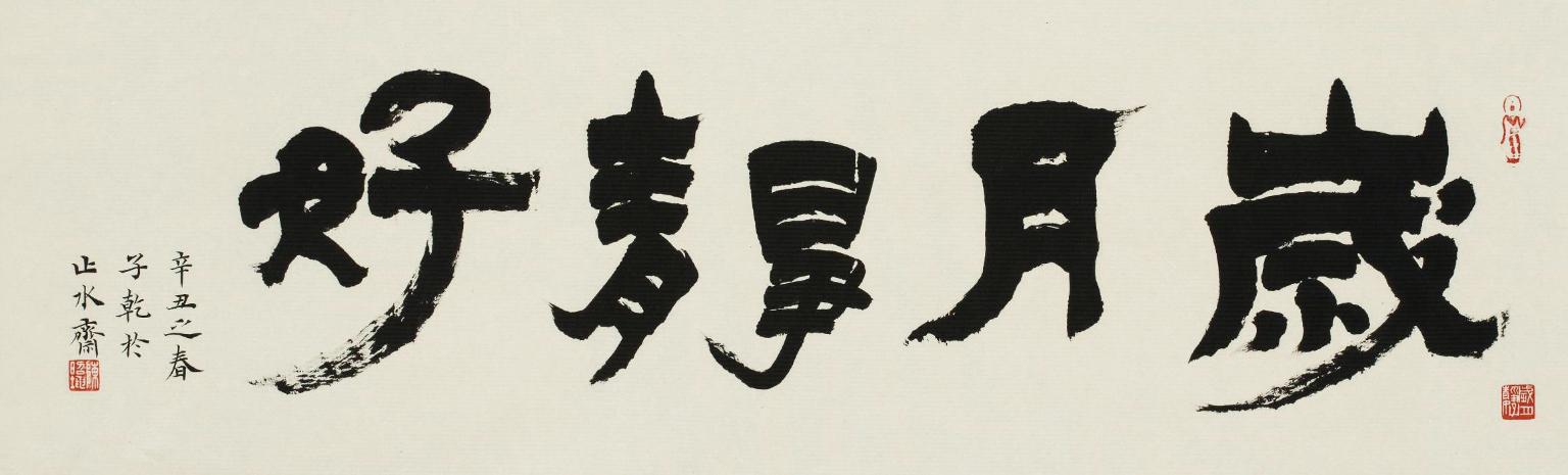 除了這兩類的作品,陳昭坤還有些是應某些展覽而作的。去年國父紀念館主辦的「書寫我的家──青年書法家邀請展」,就要求書家以自己家鄉為主題,進行創作。曾經有一段時間生活在鹿港龍山寺旁的他,永遠都忘不了每逢初一十五時,從寺裡傳來的齋姑誦經聲,於是便創作了〈龍山聽唄〉這件作品。再來就是為今年台中藝術博覽會所創作的幾件作品,因為展覽的空間不大,所以,準備的大部分是小品,如以金農漆書筆意表現的〈歲月靜好〉,便用少數字表達了他對靜好歲月的渴盼,因為這兩年大家實在過得太苦了。又有一件是書寫蔣捷的〈虞美人 聽雨〉,他用近於趙孟頫的秀雅小行書寫下,因為詞中傳達的人生體會實在讓人心有戚戚焉。