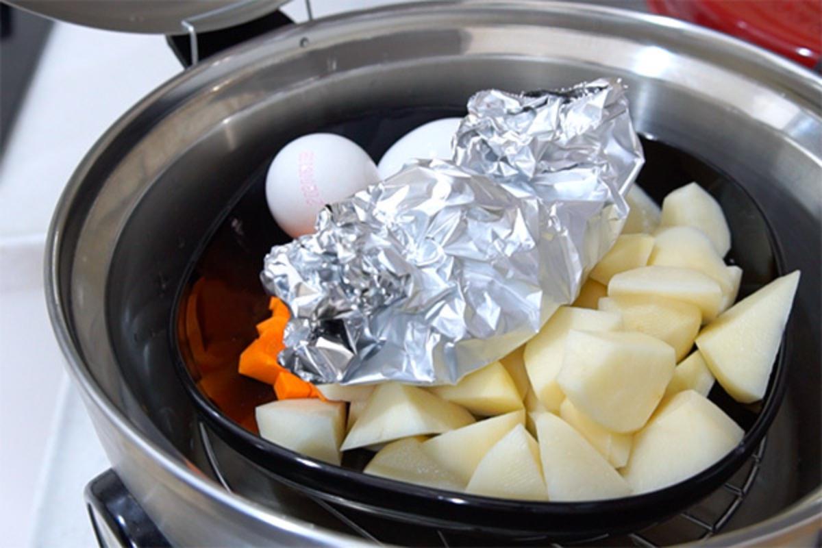 馬鈴薯切塊,胡蘿蔔切丁,雞胸鋁箔包覆,與雞蛋一起進電鍋蒸熟。(外鍋1杯水)