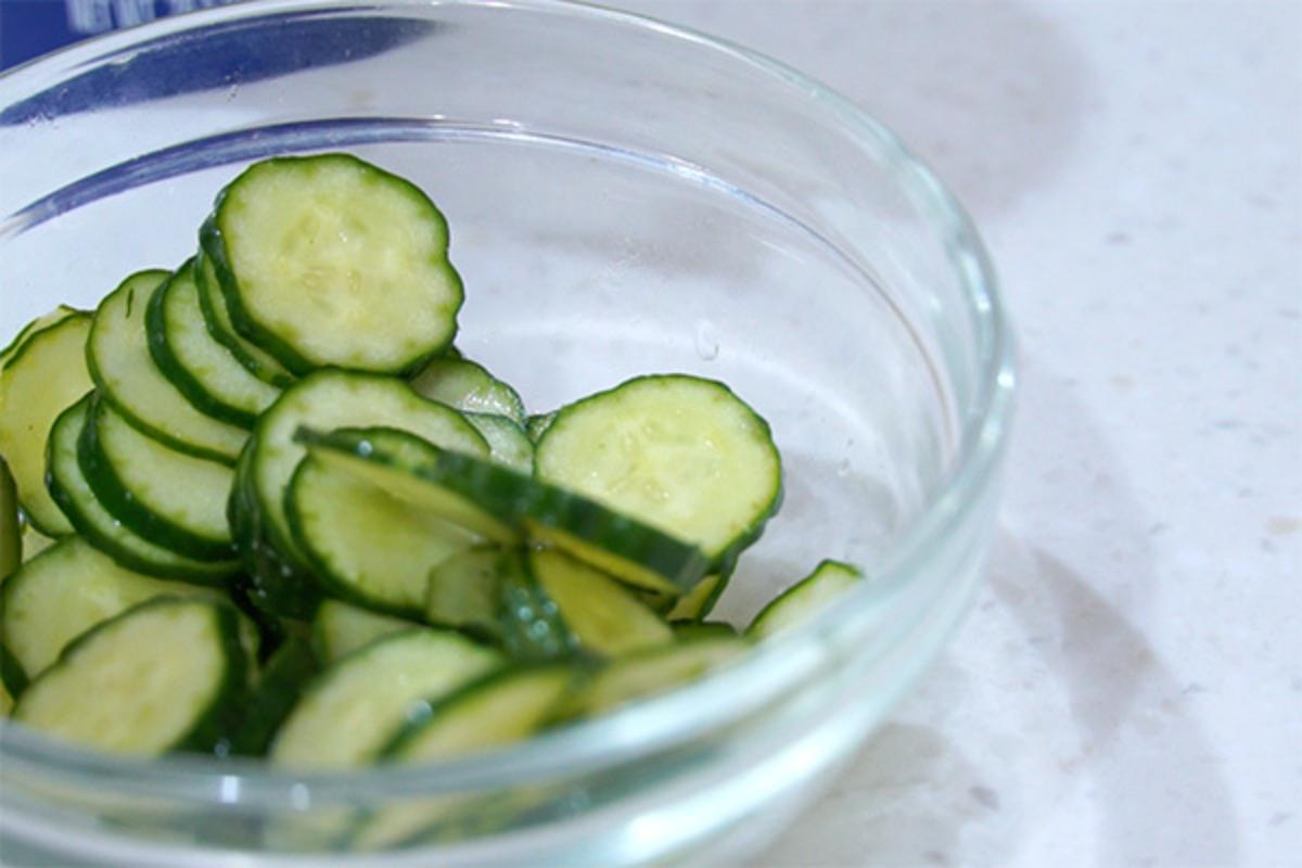 小黃瓜切片鹽巴鹽漬5分鐘,擠出多餘水分。