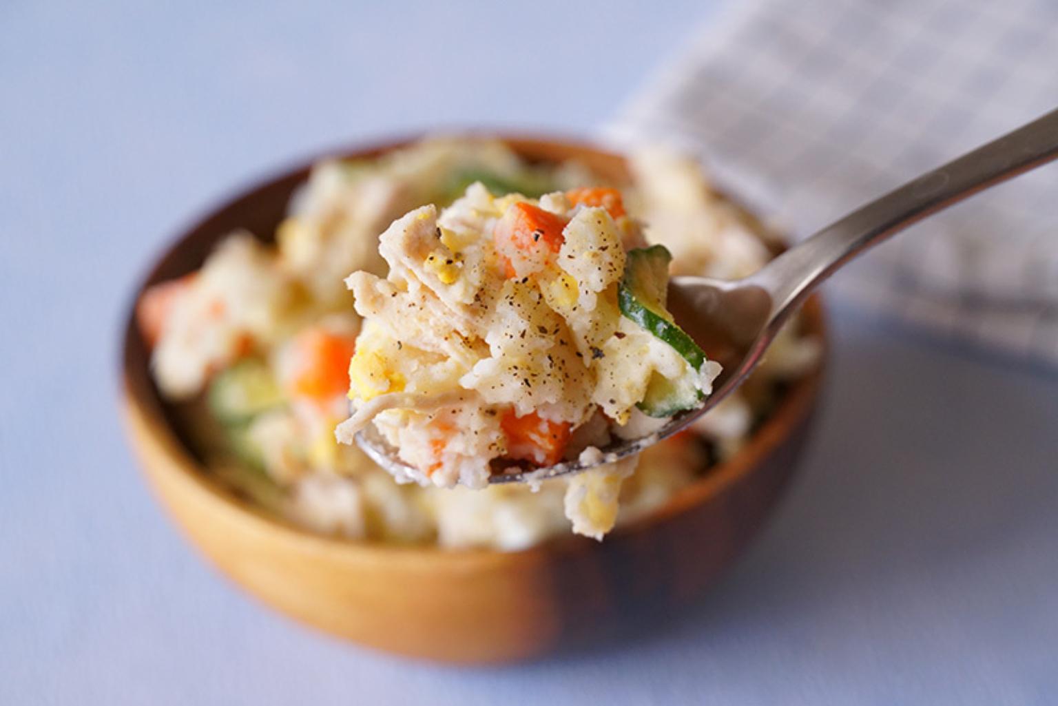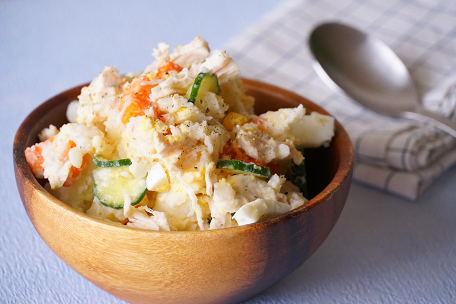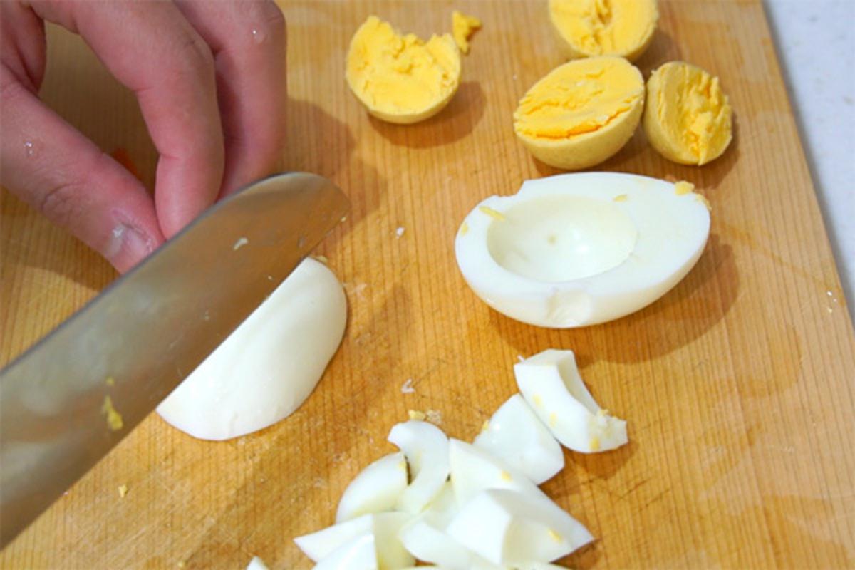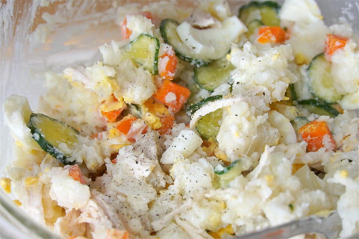 馬鈴薯、胡蘿蔔丁、鹹小黃瓜、蛋黃、蛋白丁全部混合,使用美乃滋、黑糊椒調味。攪拌均勻就完成。
