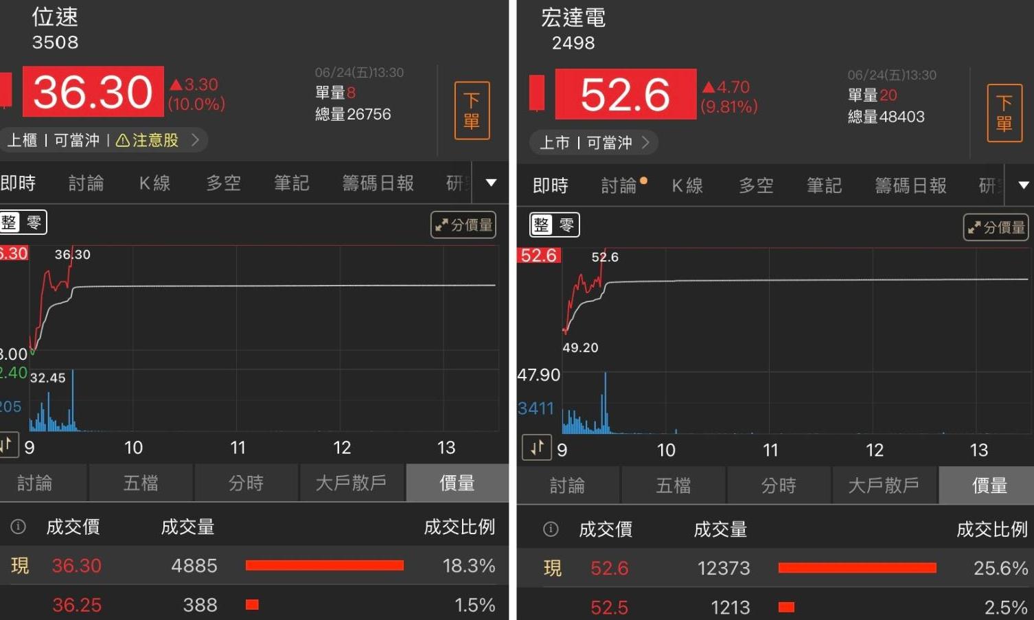 宏達電、位速在24日幾乎同一個時間,9點25分被拉到漲停板鎖死,威盛晚2分鐘約9點27分才漲停鎖死,當天開盤買進的投資人歡心雀躍,但無券放空當沖客被嘎空「災情」慘重。