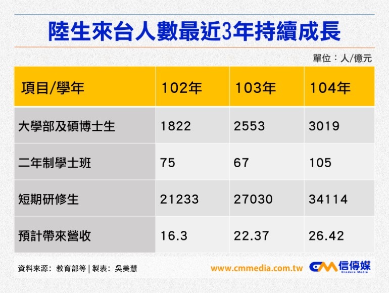 以最近3年陸生來台人數來看,主力群眾是短期的研習生與交換生,每年從萬人起跳,這些人來台的時間,短則幾天,長則一學期。不管這些學生是以什麼身分進來,對學校來說,收入都會增加。在費用方面,除了交換生的學費是繳給當地的學校外,其他的都由台灣學校收取。所以,陸生的多寡直接影響到學校的收益。