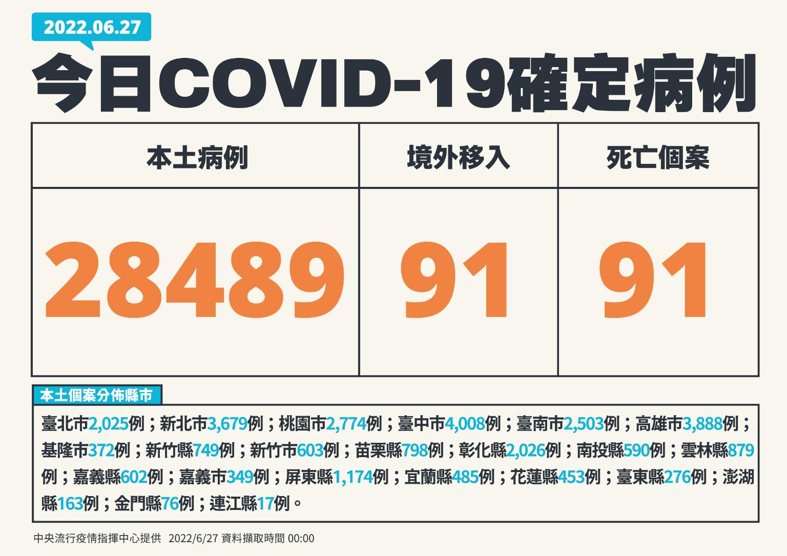 中央流行疫情指揮中心今(27)日公布國內新增28,580例COVID-19確定病例,分別為28,489例本土個案及91例境外移入;另確診個案中新增91例死亡。