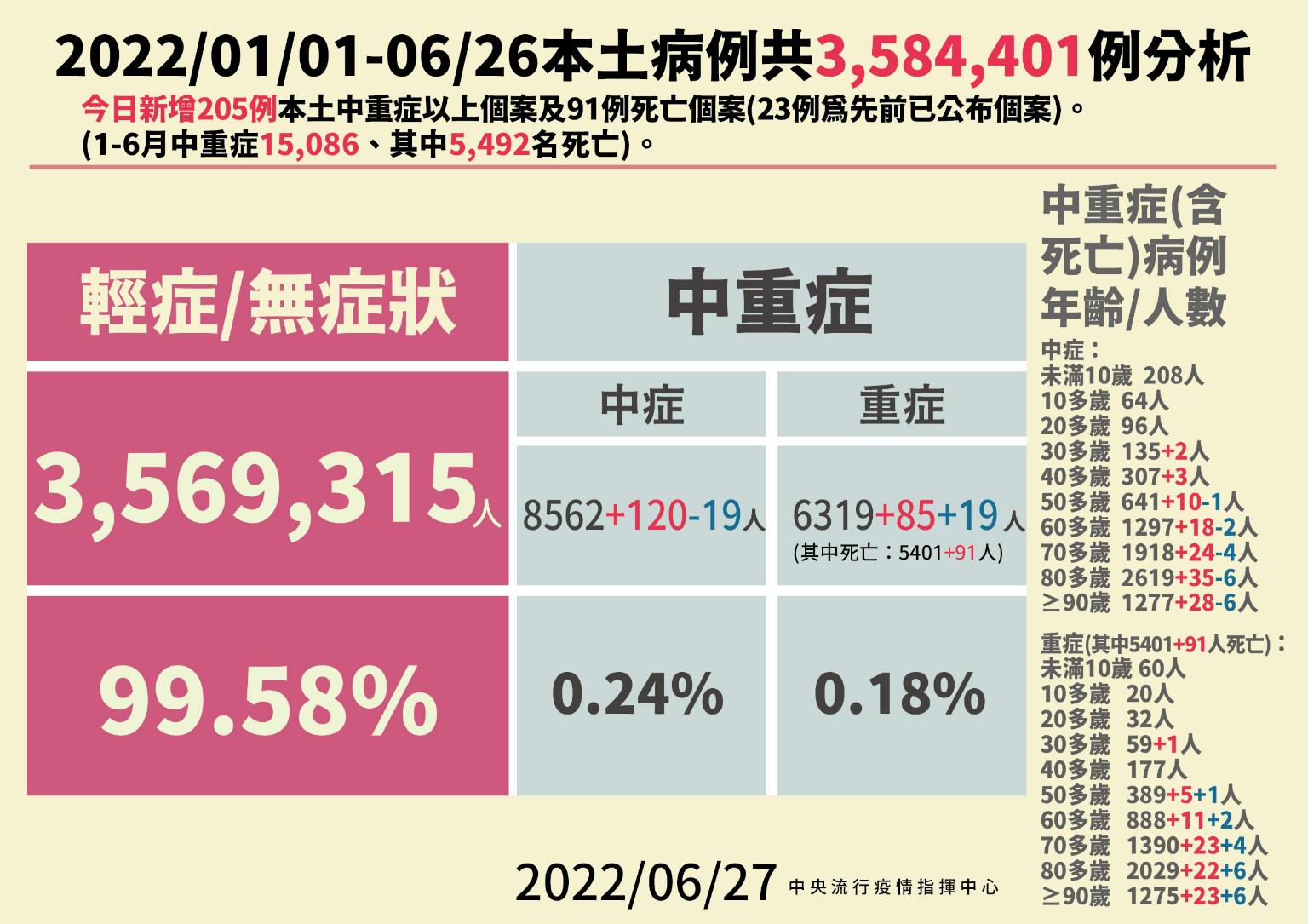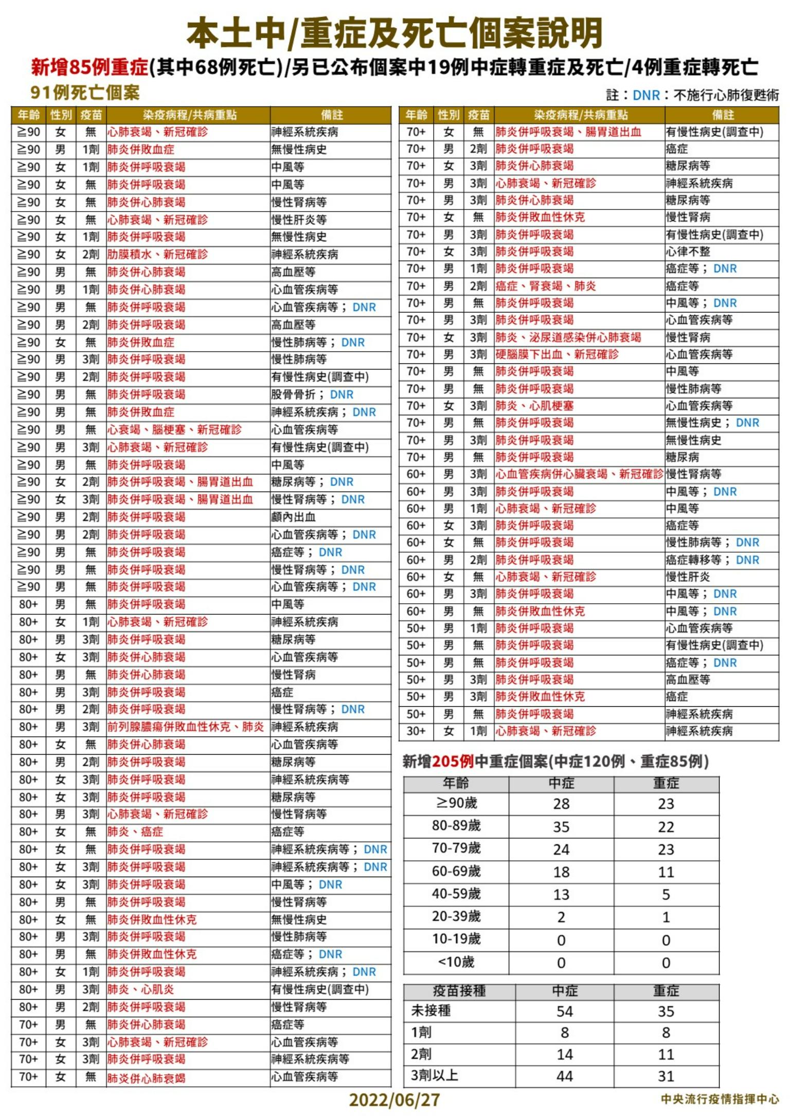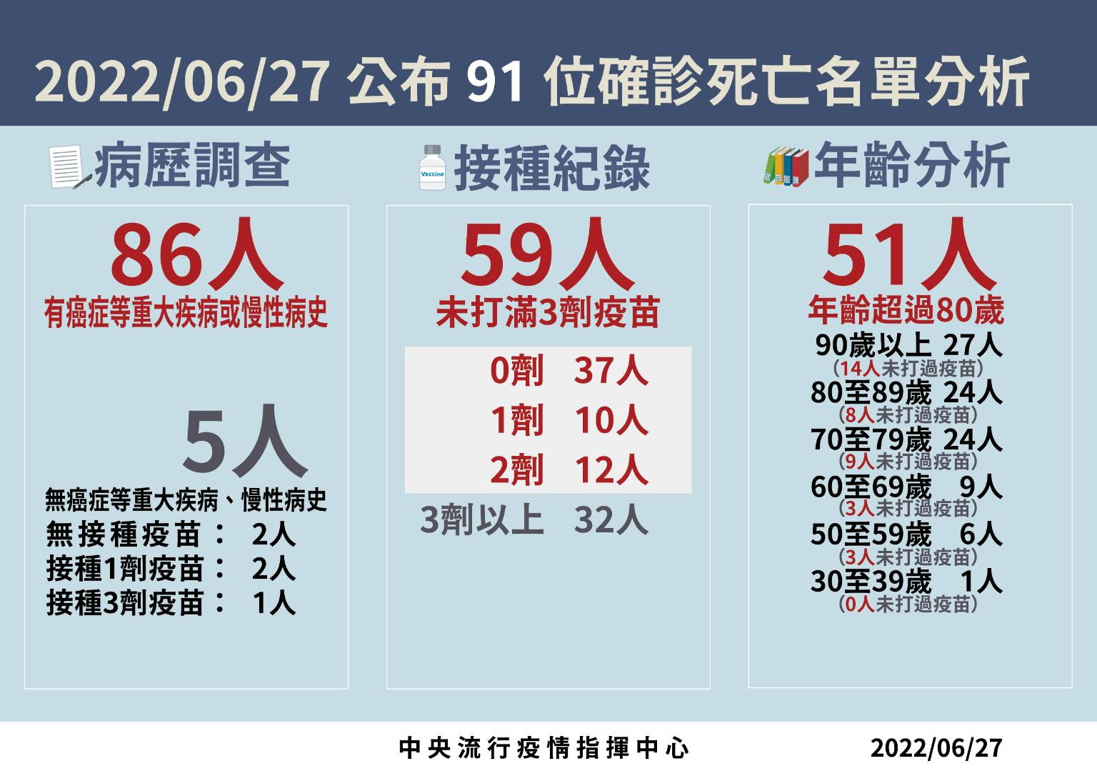 指揮中心指出,今日新增91例本土病例死亡個案,為57例男性、34例女性,年齡介於30多歲至90多歲以上,皆屬重度感染個案、86例具慢性病史、59例未接種3劑 COVID-19疫苗。確診日介於今(2022)年5月11日至6月24日,死亡日期介於5月11日至6月24日,詳如新聞稿附件。