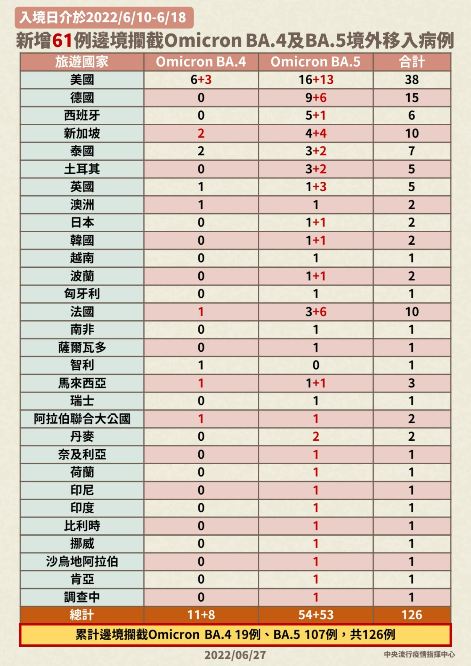 指揮中心表示,國內境外移入個案中新增檢出8株Omicron BA.4及53株Omicron BA.5,個案分別為40例男性、21例女性,年齡介於未滿10歲至60多歲,入境日介於今(2022)年6月10日至6月18日。