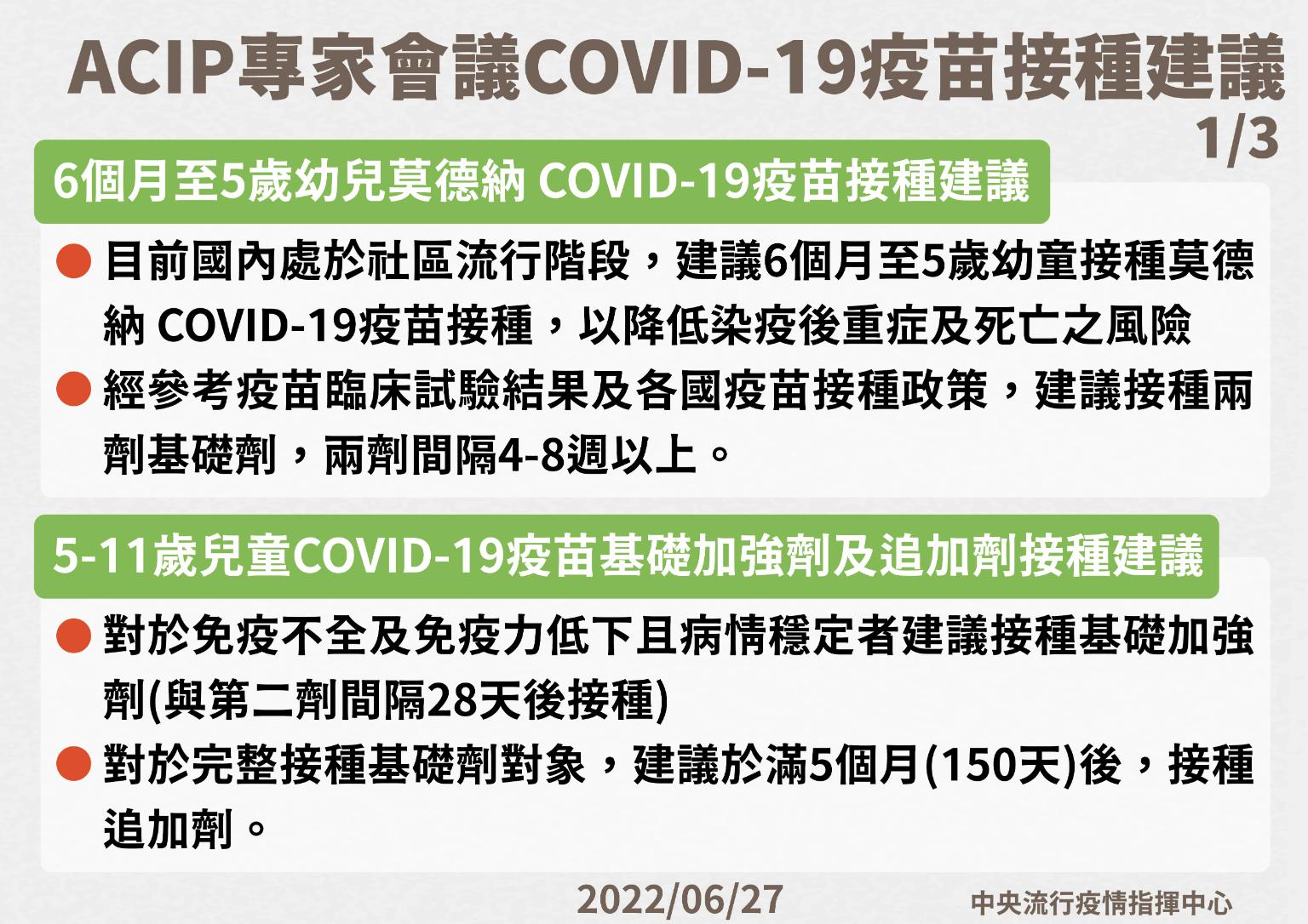 中央流行疫情指揮中心今日表示,衛生福利部傳染病防治諮詢會預防接種組(ACIP)專家會議於今日上午召開,會中就6個月至5歲幼兒接種莫德納 COVID-19疫苗、5至11歲基礎加強劑及追加劑接種、18歲以上民眾Novavax接種、COVID-19確診者疫苗接種,以及機場港埠、居家檢疫、航空機組員及機構與社福照護系統相關工作人員第2次追加劑等議題進行討論。經評估疫苗臨床試驗結果、國際間疫苗安全性監測數據、疫苗有效性研究結果及國內外疫情風險,參酌各國疫苗接種政策,建議如下: