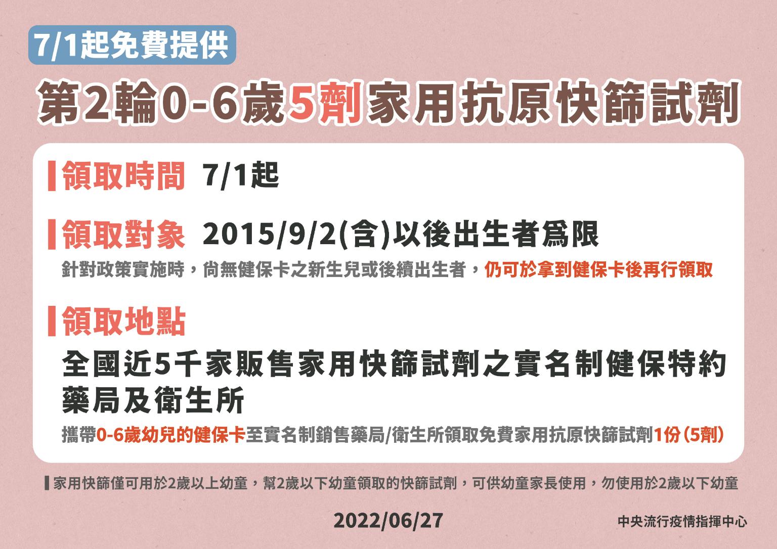 中央流行疫情指揮中心今日表示,因應滿6個月至5歲幼兒COVID-19疫苗施打作業尚未進行,為保護幼兒健康,自今(2022)年7月1日起,將免費提供第二輪5劑家用抗原快篩試劑給學齡前幼兒(0至6歲),民眾可持2015年9月2日(含)以後出生的學齡前孩童健保卡,至各快篩實名制販售據點再免費領取一份5劑家用快篩試劑。