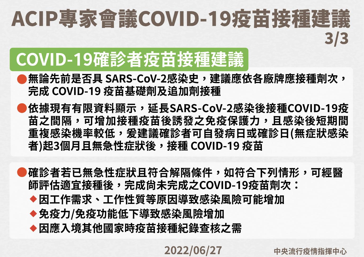 (三)確診者若已無急性症狀且符合解隔條件,如符合下列情形,可經醫師評估適宜接種後,完成尚未完成之COVID-19疫苗劑次: