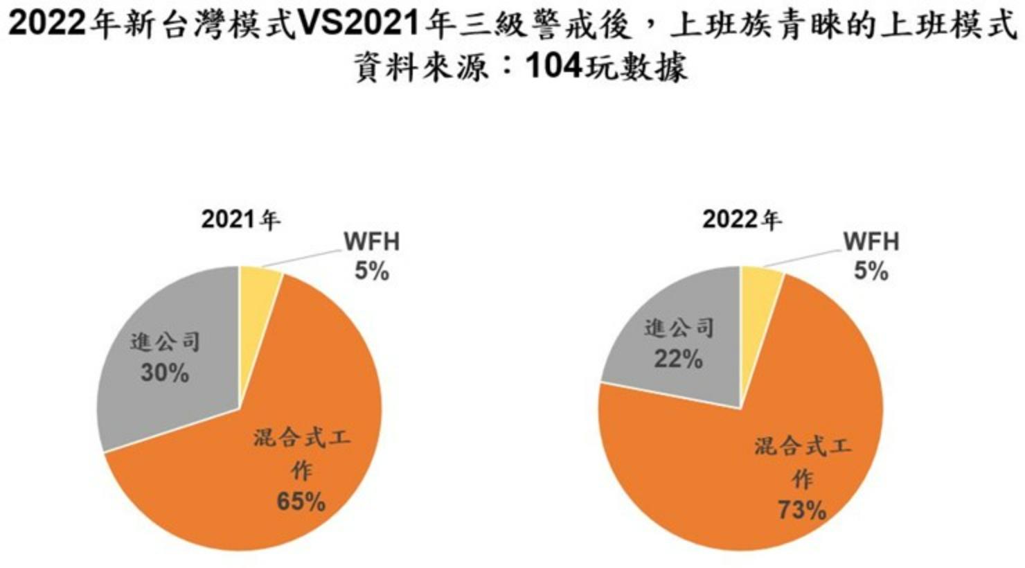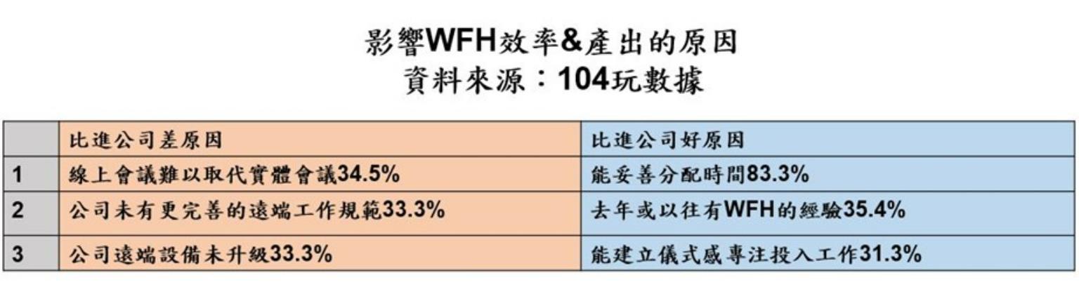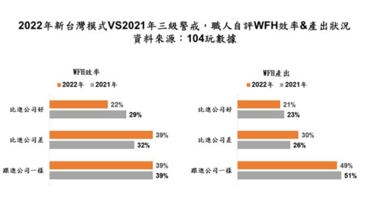 今年多數企業與疫共存,104玩數據調查,今年有26.6%的上班族曾WFH,比去年的34.8%少。上班族經歷第二波WFH,39%的受訪者認為「WFH工作效率比進公司差」,高於去年的32%;30%的受訪者認為「WFH工作產出比進公司差」,高於去年的26%。