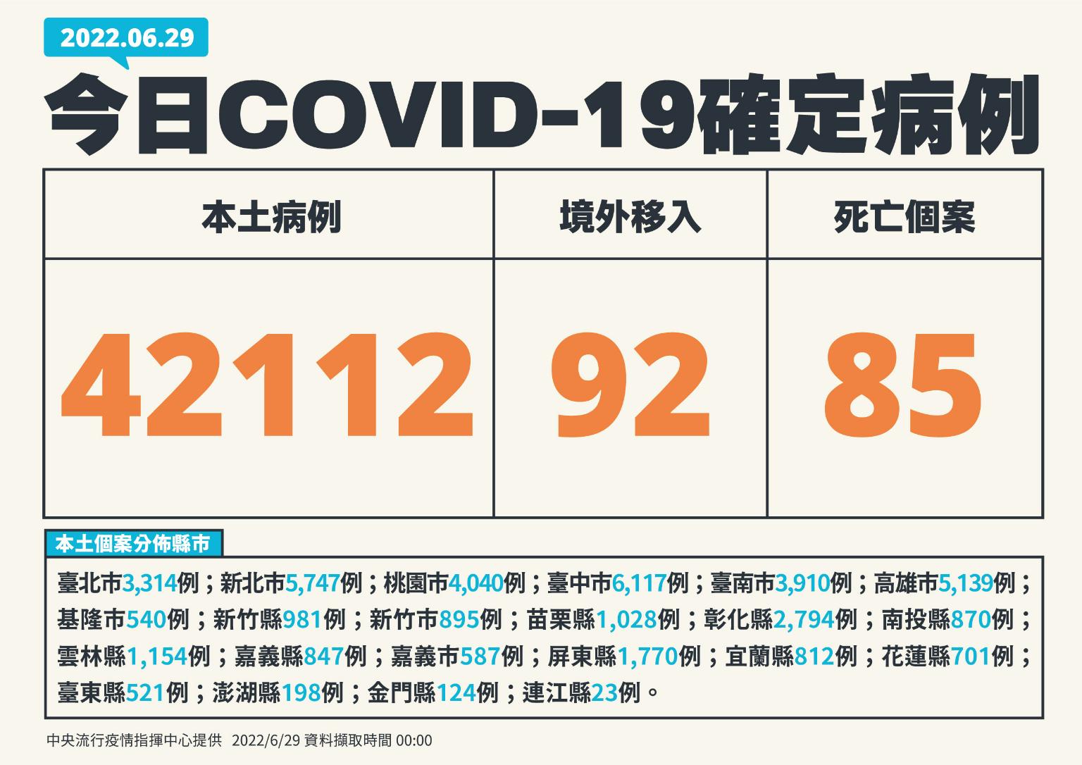 中央流行疫情指揮中心今(29)日公布國內新增42,204例COVID-19確定病例,分別為42,112例本土個案及92例境外移入;另確診個案中新增85例死亡。